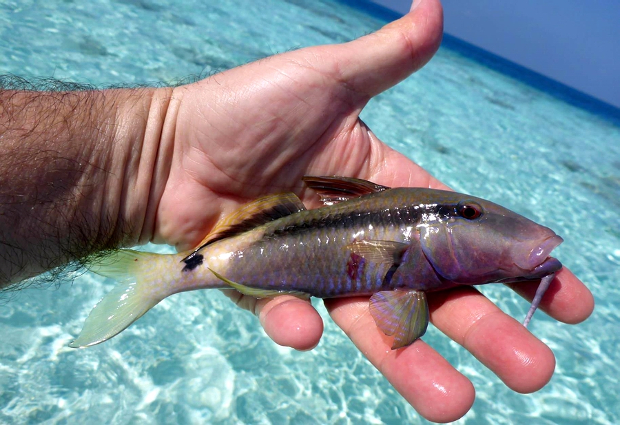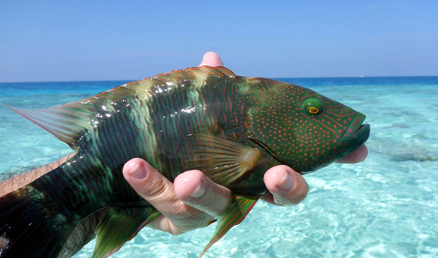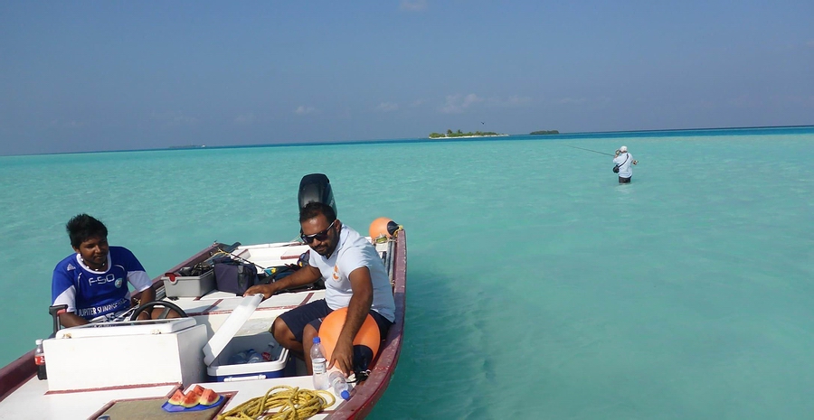 Ein Wort zum Guiding. Im Vorfeld der Buchung wurde uns klar gesagt, dass es keine Erfahrung mit dem SWFF gibt. Wir waren also darauf vorbereitet und waren bewusst dieses Risiko eingegangen. Für unsere Guides war das ein nicht einfaches Unterfangen, am Anfang hatten die Herren natürlich keine Ahnung, was wir so brauchten. Es war also wichtig, ganz klar zu sagen, was wir wollten. Das Thema Wurfweite und das richtige Stellen des Bootes zum Wind war schwierig zu Erklären. Einmal sahen wir auf der Fahrt Vogelschwärme, die am Innenriff eine Schule kleinerer BTs oder GTs folgten. Für einen Big Gamer natürlich kein Ziel, für uns Fliegenfischer aber hochinteressant. Wir wollten daher hinterher. Viele Versuche folgten, da der Schwarm natürlich immer in flache Gebiete mit Korallen hinein raubte, wo wir mit dem Boot nicht folgen konnten. Endlich war der Schwarm direkt vor uns und das Boot lag genau gegen den Wind. Unser Captain war überzeugt sich bestmöglich positioniert zu haben und schrie aufgeregt „Cast, cast – quick“. Wir schafften gegen diesen Wind keinen einzigen ordentlichen Wurf, alle waren zu kurz. Es war zum Haare ausreißen. Nach einigen Tagen hatten wir uns so richtig aneinander gewöhnt. Man darf sich also am Anfang als Fliegenfischer nicht zu viel erwarten. Die Einheimischen wissen allerdings, wo der Fisch ist und das ist wichtig. Und – sie sind zuvorkommend, freundlich und wirklich bemüht. Herrlich war der Abschied, unsere zwei Guides lachten über das ganze Gesicht und wachelten die ganze Zeit als Abschiedsgruß mit einem Arm, die Wurfbewegung mit der Fliegenrute nachahmend. Wir waren auch sicherlich die absoluten Exoten dort. Unbehagen im Vorfeld hat uns die dort übliche Catch and Kill Politik bereitet. Das hatte uns in der Dimension - bezogen auf manche Fotos im Netz- nicht gefallen. Klar, es ergibt keinen Sinn, die Fische zu releasen und dann vom nächsten Boot für das Abendessen wieder zu kaufen. Es geht aber wie immer um das Maßhalten. Wir haben uns dieser Politik nicht angeschlossen und bis auf den einen Sail, der nicht releasbar war, alle releast. Die Filets des Sails haben beim Abendessen übrigens köstlich gemundet. Zu den Fängen, wir konnten neben mehreren größeren Bluefins Trevallies und Hornhechten viele wunderschöne Rifffische landen. Die Vielfalt der Arten war unglaublich, im Tag fingen wir zwischen 20 und 40 Fische, allerdings zumeist kleinere. Eine Landung größerer GTs blieb uns, wie bereits erwähnt, leider verwehrt. Viele Haie, als geschützte Art auf den Malediven, konnten wir nicht für unsere Fliegen interessieren. Bonefische soll es geben, allerdings nicht in diesem Atoll. Thunfisch auf Fliege wäre eine weitere Möglichkeit gewesen, naja, das nächste Mal. Ein Wort zur Betreuung und Verpflegung der Jupiter