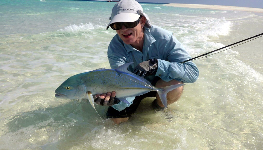 An guten Tagen konnten wir mehrere herrliche Bluefin Trevallies fangen. Bester Köder war der Gummi Minnow, Größe 2. Wichtig war die Geschwindigkeit beim Strippen - so schnell wie wir konnten, war gerade gut genug. Eingeklemmte Rute unter der Achsel und mit zwei Händen Vollgas geben. Eine gute Taktik war, nach dem Wurf während des Einstrippens gleichzeitig zurück auf den Sand zu Laufen, um die Einholgeschwindigkeit zu steigern. Wenn dann so ein Trevally hinter der Fliege her war, sind diese immer eine Weile hinten nach. Richtig verrückt sind diese dann geworden, wenn die Fliege schon fast am Sand auf geschwommen ist. Es hatte dann wahrscheinlich für den Trevally so ausgesehen, als wollte sich der gute Happen noch schnell ins ganz, ganz flache Wasser verdrücken. Der Biss kam dann brachial in ein paar Zentimeter tiefen Wasser, wir standen dabei schon mal auf der Kuppe der kleinen Sandinsel. Aber dadurch gab es auch weniger Scheuchwirkung. |