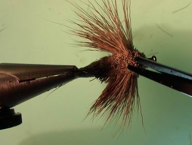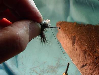 Vorsicht, nicht zuviel wegschneiden, sonst könnte man in den Faden schneiden und das Rehhaar würde sich vom Haken lösen! |