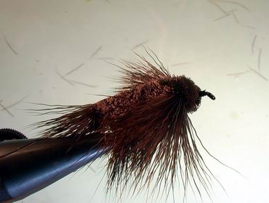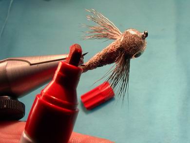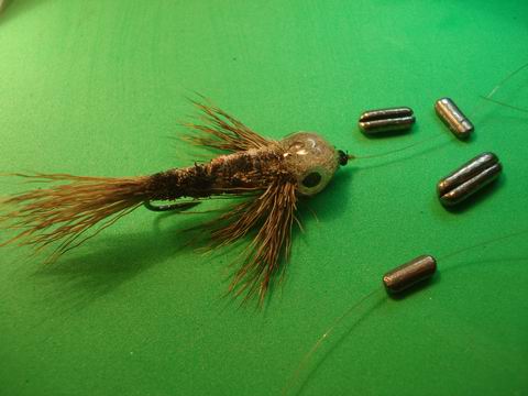 Man könnte auch auf des Klemmblei verzichten, muss dann allerdings den Haken selbst mit etwas Blei beschweren, da der Fischkörper einen großen Auftrieb hat. Zusätzlich erweist sich das Aufbringen des Rehhaars auf diese Bleiwicklung als äußerst schwierig. Jedoch erleichtert es das Werfen ungemein, wenn die Koppe nicht selbst beschwert ist. |