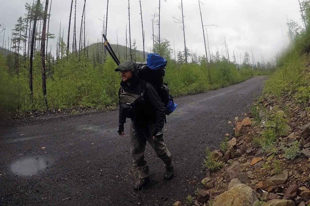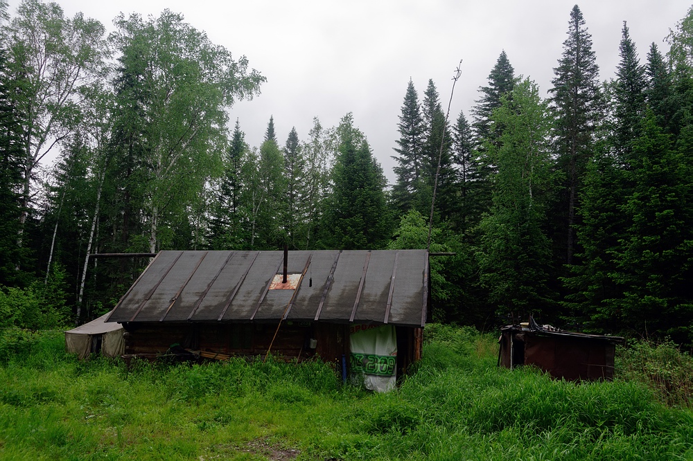 | Als ich auf der anderen Talseite bei der zweiten Marsch-Schicht das nächste Zwischenlager erreiche und eine Plane als Regenschutz aufspanne, höre ich ein Motorengeräusch, drehe mich um – und sehe hinter mir einen Geländewagen, aus dem ein in typisch russischer Art Vollcamouflage tragender Jäger samt Gewehr steigt. Er ist ebenso überrascht wie ich – er trifft das erste Mal hier in seinem Jagdrevier einen Touristen, und ich hatte gedacht, dass die Straße hierher nicht befahrbar wäre. Offensichtlich gibt es eine weitere Möglichkeit, über die Berge dieses Segment der Forststraße zu erreichen. Der Jäger lädt mich in seine nur wenige Kilometer entfernte Jagdhütte ein. Ich nehme das Angebot dankend an, bietet das doch eine perfekte Möglichkeit, mein Zeug zu trocknen. Es könnte auch sehr interessant sein, wie der Waidmann lebt und was er über die Tierwelt hier zu erzählen weiß. Wir holen die zweite Hälfte vom Zwischenlager, und zweigen einen sumpfigen Weg ab, der jetzt im Sommer fast unbefahrbar ist. Am Ende findet sich eine Blockhütte, die aussieht wie aus dem 19. Jahrhundert. Der Russe lebt hauptberuflich von der Jagd, verwendet insgesamt fünf oder sechs solcher Hütten, er erlegt vor allem Hirsche. Die lockt er mit Salz an eine Kirrung, was bei langanhaltendem Regenwetter wie jetzt nur schwer möglich ist, darum ist er mit dem Jagderfolg nicht zufrieden. Nur zwei Kilometer von dieser Hütte entfernt hat er unlängst einen Tiger gesehen. Die letzten ca. 500 bis 600 Sibirischen Tiger haben in den entlegenen Mischwäldern des Sichote-Alin ihre letzte Zuflucht gefunden und erreichen in der Gegend am Koppi ihre nördliche Verbreitungsgrenze. Die Jäger hier sehen Tiger als Beutekonkurrenten. Ob mein Gastgeber auch dieses streng geschützte Raubtier erlegt, frage ich erst gar nicht. Wie mehrfach auf dieser Reise bewährt es sich bei Kontakten zu den Einheimischen sehr, allein unterwegs zu sein. Naturverbundende Menschen begegnen einem so mit großem Respekt, die übrigen halten einen für verrückt, allesamt sind sie sehr hilfsbereit. Mein Gastgeber kennt auch den Koppi Fluss perfekt und kann mir viele Details über die bevorstehende Strecke verraten. |