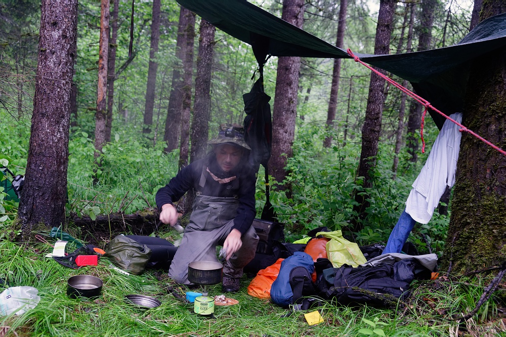 | Am Abend bringt eine Messung ein überraschendes Ergebnis: Die Wassertemperatur beträgt jetzt, am 22. Juni und 450 m über dem Meeresspiegel, nur 3°C! Auch weiter stromab am Koppi steigt die Temperatur kaum höher, erst im Unterlauf messe ich – trotz der dann deutlich wärmeren Witterung – maximal 7°C. Vermutlich ist der Boden in den Bergen noch nicht vollständig aufgetaut und es tritt dort eiskaltes Wasser aus. Nicht verwunderlich also, dass der karge Fluss hier oben vor der Ankunft der anadromen Lachse nur einen eher spärlichen Fischbestand aufweist. Während der Förster meinte, dass hier Buckellachse aufsteigen und deshalb Unmengen an Bären zu erwarten sind, wusste der Jäger, dass die Lachse weiter in den Koppi-Oberlauf ziehen und nicht in den Iggu abzweigen. |