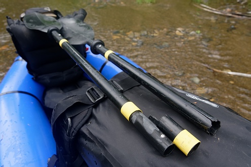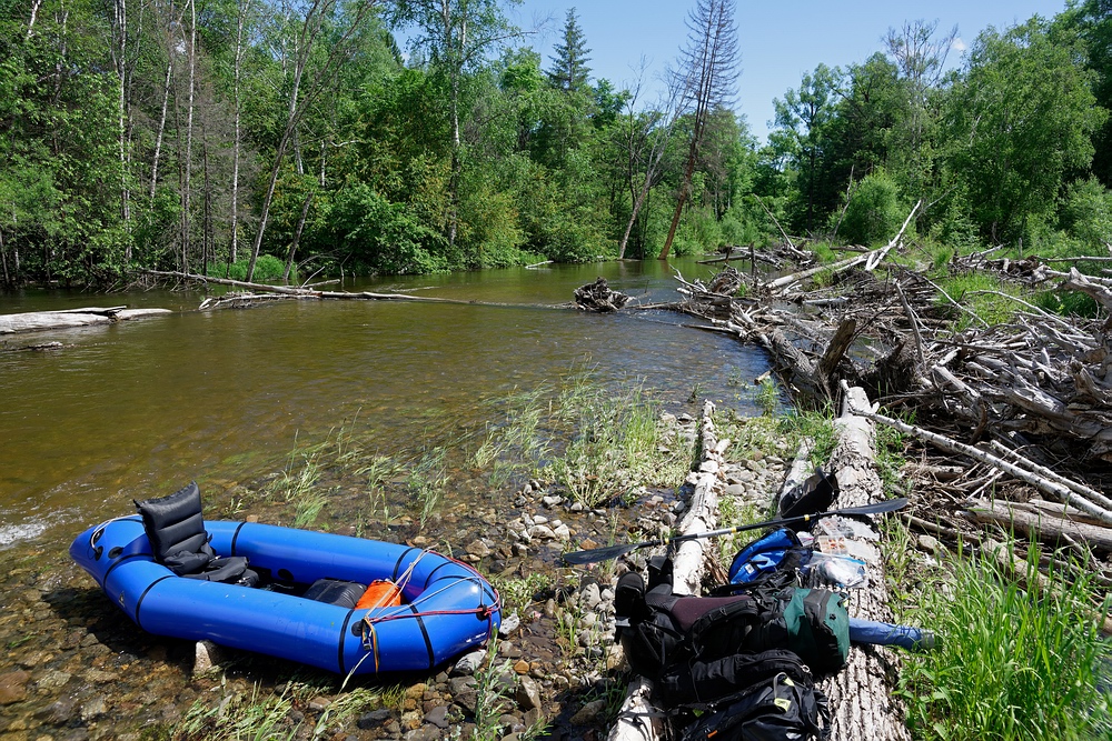 Auf immer enger werdenden Forststraßen fahren wir also noch vielleicht 20 km weiter, als wir als Endpunkt eine Brücke über den Iggu erreichen. Zum Dank beschenke ich den darüber sehr erfreuten Fahrer mit dem Rad, das ich ja nicht mehr brauchen würde, und auf dem winzigen Packraft nicht mitnehmen könnte. Dann beginne ich meine Ausrüstung zu sortieren, das Boot aufzublasen und zu beladen. Der Fluss weist bei etwas erhöhtem Abfluss von geschätzt 5 m3/s schon eine ausreichende Größe auf. Ich versuche aber das aufkommende Hochgefühl – schließlich stehe ich am Beginn einer großartigen Bootstour bis hinunter zum Meer – zu zügeln, denn ich weiß: Es ist mit dem Schlimmsten rechnen, und zwar aufgrund der in so einem Waldflüsschen zu erwartenden Verklausungen durch quer liegende Holzstämme. Dass die schlimmsten Erwartungen der Realität nicht gerecht werden sollten, sondern eher die allerschlimmsten, würde ich erst einige Stunden später realisieren. |