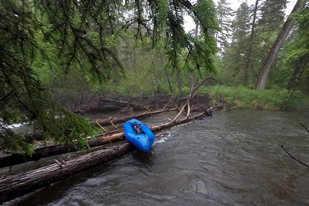 Eine Goldene Regel beim Befahren solcher Wildflüsse ist, die Beladung ausnahmslos immer fest mit dem Boot zu verzurren. Eigentlich halte ich mich auch immer daran, nicht aber dieses eine Mal, als ich nach dem Umtragen einer Verklausung den schweren Rucksack auf das Boot werfe und keine 100 m weiter die nächsten Bäume erblicke, die schon wieder umtragen werden müssen. Eine fatale Entscheidung. Ich steige ob der kurzen Strecke nicht ins Boot, sondern führe es watend stromab, wobei ich es mehrfach vom Ufer abstoße, um es an Hindernissen am eigenen Ufer vorbei zu bringen. Schon tausendmal gemacht und total safe. Doch dieses eine Mal befindet sich auch am gegenüberliegenden Ufer ein Wurzelstock, und ich schubse das Boot ein klein wenig zu stark, sodass das Boot dort anstößt, sich zwischen den Hindernissen dies- und jenseits verklemmt und in der schießenden Strömung blitzschnell umgedreht wird. Ich kann das gekenterte Boot in der Strömung nicht mehr halten, sodass der große Rucksack, ein weiterer Packsack, Rutenrohr, Fototasche, Fischertasche und Boot, insgesamt also sechs Gegenstände, getrennt den Fluss hinuntergerissen werden, und zwar auf die nächsten quer liegenden Bäume zu. Mir ist sofort klar, dass ich mich von einer auf die andere Sekunde in einer äußerst brenzligen Situation befinde. Es klingt klischeehaft, aber entspricht nun mal am ehesten den Empfindungen: Im Kopf läuft ein Film ab, der die wenigen und durchwegs bitteren Optionen visualisiert: Eigentlich sollte ich – jetzt mitten im eiskalten Bach schwimmend – schleunigst raus, um nicht in ein Hindernis gerissen zu werden und zu ertrinken. Die Ausrüstung wäre dann wohl verloren und die Reise zu Ende. Irgendwie könnte ich mich wohl zu den Wächtern am Schranken zurückschlagen. Option B wäre, so schnell wie möglich nachzuschwimmen und zu versuchen, die lebensnotwendige Ausrüstung zu bergen. Und dazu entscheide ich mich, erreiche kurz vor den querliegenden Bäumen das Boot und erhasche zwei kleine Taschen, die ich auf die Verklausung schiebe bzw. werfe. Dann werde ich selbst von der Strömung gegen das Holz gedrückt, kann nur schwer atmen, erreiche mit den Zehenspitzen den Grund und kann so verhindern, unten durch gezogen zu werden. Urschreie ausstoßend weckt der Überlebenswille ungeahnte Kräfte, sodass ich mich seitlich aus der Strömung schieben und nach zähen, bangen Sekunden über die Bäume wuchten kann, während ich mit zunehmender Verzweiflung den um die nächste Krümmung verschwindenden Säcken nachblicke. Darin befindet sich alles, was man als durchnässter Mensch in der baldigen Nacht rasch und dringend benötigen würde. Also nach den Querbäumen sofort wieder ins Wasser und teils schwimmend, teils watend so schnell es geht um die Krümmung, um wieder Sichtkontakt herzustellen. Mist, der Fluss verzweigt sich! Wo ist der (leider schwarz-grün gut getarnte) Rucksack abgezweigt? Ich entscheide mich für links und habe Glück: Er hängt sichtbar in diesem Flussarm in einer Fichte, und gleich dahinter der zweite Packsack. Die Wassertiefe und die Strömung sind dort nur mäßig hoch, sodass ich die Stelle erreichen kann, eine Schnur am Rucksack befestige und ihn so ans linke Ufer abschleppe. Dann quere ich sofort zurück zum Packsack und berge auch diesen. In diesem Moment realisiere ich, welch unwahrscheinliches Glück ich hatte, diese Situation unbeschadet überstanden zu haben! |