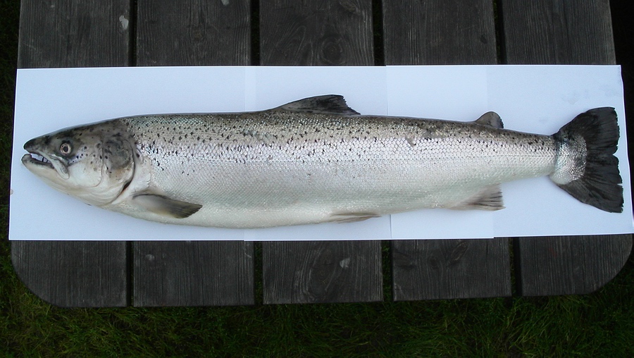 – aber kein echter! Es handelt sich um einen entkommenen Farm-Lachs, der