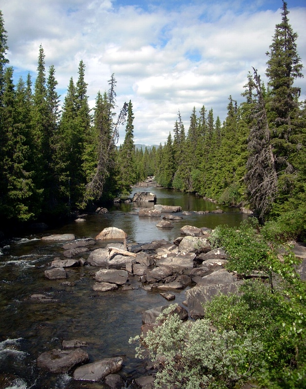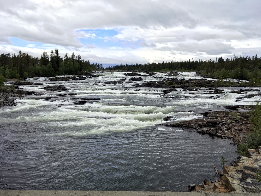 Natürlich musste ich auch einmal an die Vojmån, jeder Äschenliebhaber kennt den Namen dieses Flusses, und wer davon nichts weiß dem wird spätestens beim Erreichen der Brücke bei Vojmåns Camping klar um was es hier geht: => Das “Kunstwerk” ist mal so locker 2 1/2 Meter lang, eine Huldigung an thymallus thymallus. So sieht der Fluss aus: |