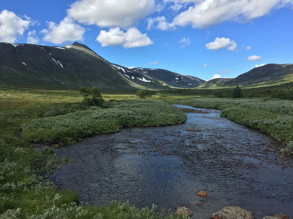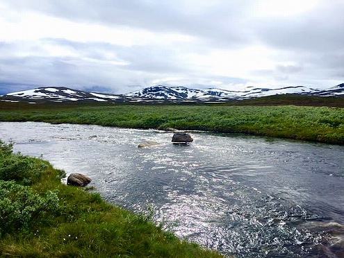 Ich hatte mich schon seit Monaten darauf gefreut, ziemlich weit oben im Klimpfjäll zu fischen. Naturerlebnis pur mit einer Wandertour von 2 1/2 Stunden, die alleine schon berauschend ist. Der Saxån folgend, finden sich dann viele kleine Bergseen, auf Sami “Duoranjaureh”. Oben angekommen, bin ich zwar nicht so erfolgreich, was die Fischerei betrifft, es gab mal wieder einen ziemlich herben Temperatursturz just an diesem Tag und so konnte ich nur kleinere Bachforellen bis 25 cm überlisten. Aber das hat dem Erlebnis überhaupt keinen Abbruch getan, echt tolles Fischen. |