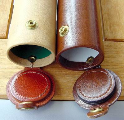| Wesentlich preisgünstiger, aber dafür auch viel nüchterner ausgestattet, kommen die Leder-Rutenrohre der italienischen Firma POZO' zu uns. Diese Rohre besitzen ein sehr stabiles und druckunempfindlicheres PVC-Innenrohr. Die Außenhülle besteht aus (welchem?) Leder, erhältlich in einem sehr hellen und einem dunklen Braunton. Alle Nähte wurden im Doppel-Kreuzstich ausgeführt. Einen Tragegriff oder Gurt gibt es bei unseren Testmodellen mit Innendurchmesser 4,5 cm nicht, jedoch eine beweglich angenietete Verschlußkappe mit Druckknopf. Der 2005er Katalog zeigt jedoch ein Modell mit zusätzlichem Tragegurt, so dass wir davon ausgehen, dass alle Modelle ab 2005 mit einem solchen ausgestattet sind. Im Zweifelsfall anfragen. Die Rohre werden in Italien auf Bestellung in jeder gewünschten Länge angefertigt. Unser Fazit: Edel schlicht und stabil, sehr schön! | ![]() |