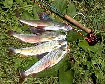 Und da klappt es – nach einiger Übung auch bei ihm. Und nun ist es an mir mit dem „Etwas- neidisch-Dreinschauen“, denn bald hält er stolz die größeren Exemplare in der Hand. Uns beiden gelingen nun auch weiterhin schöne Äschenfänge von bis zu 40 cm Länge, und das sowohl beim Flussab- als auch beim Flussaufwärtsfischen mit gestrecktem Wurf. |