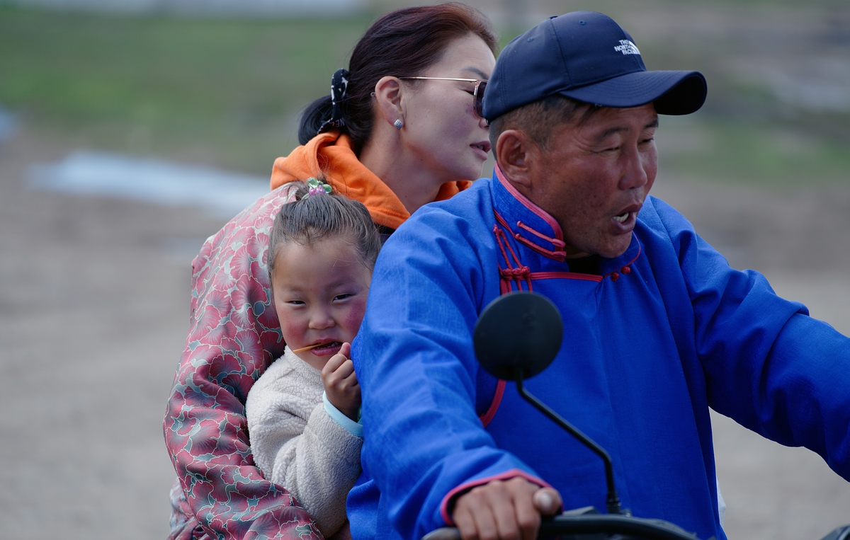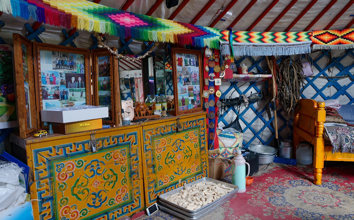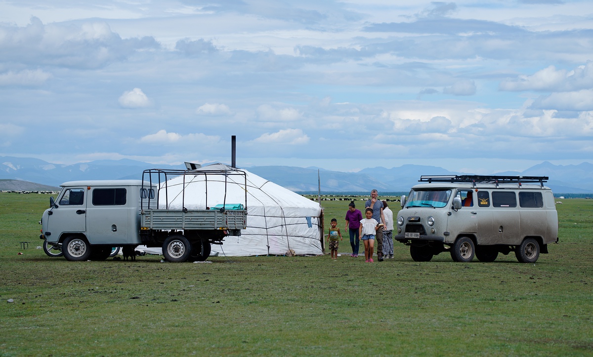 | Schon unvorstellbar, dass diese ganze Region im Norden und Westen völlig unpassierbar, im Süden und Osten nur über ein paar Erdstraßen mit dem Rest der Welt verbunden ist. Bei günstigen Bedingungen braucht man einen langen Tag, um von Mörön hierher zu kommen. Wir schaffen es – teils mehr in Lachen und Flussläufen als auf dem Trockenen fahrend – in eineinhalb Tagen. Der Fahrer unseres UAZ Allradbusses russischer Bauart hat seine Familie mitgenommen und verbindet den Trip mit Verwandtenbesuchen. Das Packen für den mehrtägigen Familienausflug dauerte nur Minuten. Mit europäischen Kindern völlig undenkbar, aber wohl steckt auch in den „Stadtmongolen“ noch immer ausreichend „Nomadenblut“ - die drei mitgebrachten Sprösslinge machen den langen Ritt über die buckelige Piste ohne jegliches Murren mit. Kindersitze und Sicherheitsgurte sind natürlich hier kein Thema. Nach Beendigung der Tagesetappe in absoluter Dunkelheit durch regendurchnässte Wiesen und Bachbette machen wir bei einer kleinen Siedlung halt, wo wir allesamt in einer Jurte nächtigen. Am nächsten Tag steuern wir schließlich eine Jurte in der weitläufigen Ebene an. Die Kinder freuen sich ihre Cousinen und Cousins zu sehen, und wir werden auf die üblichen Spezialitäten eingeladen, die für mitteleuropäische Mägen nur bedingt zu empfehlen sind. |