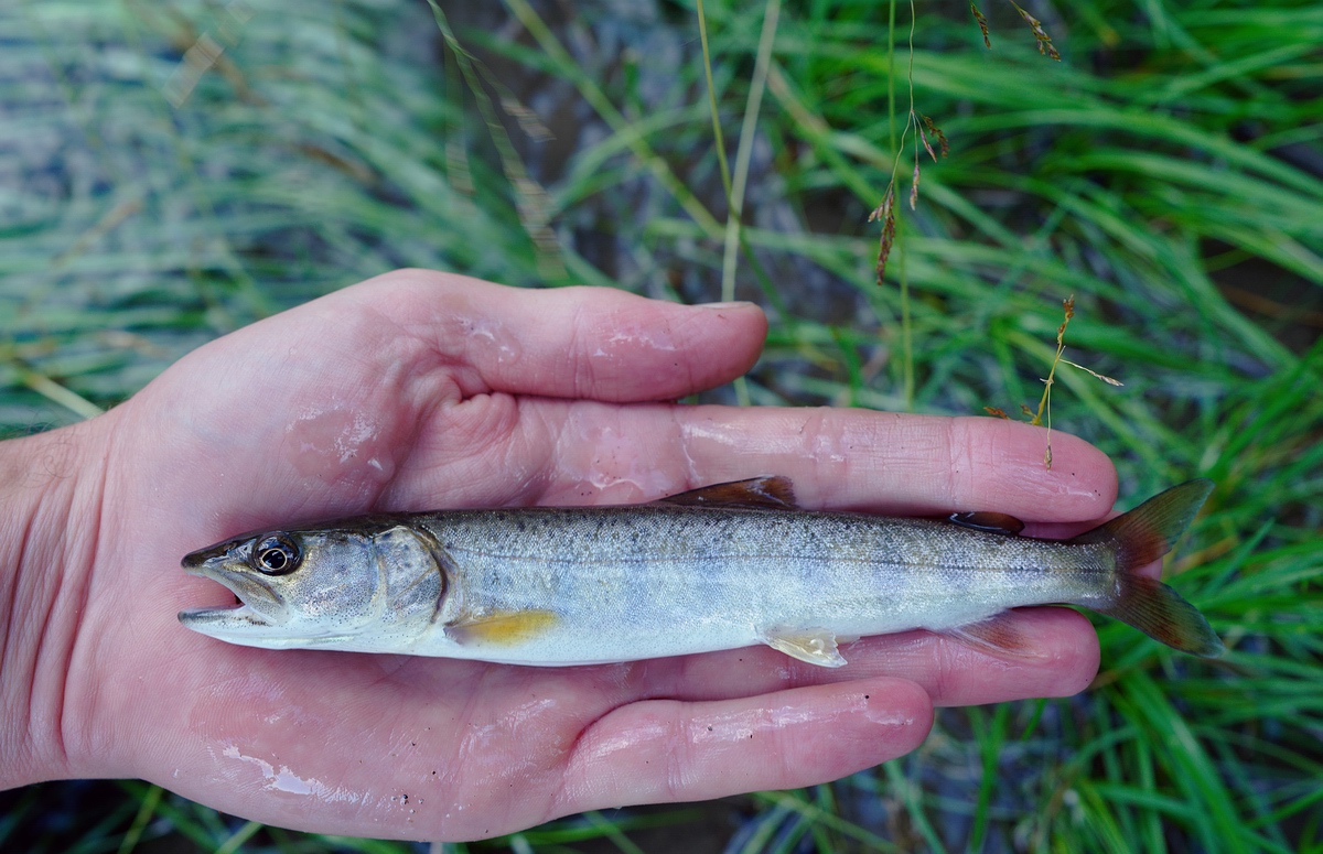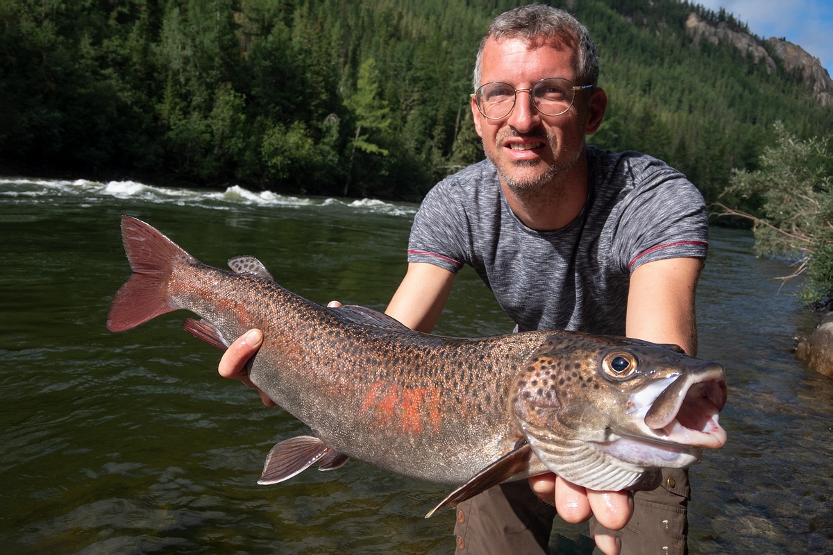 Wie in dem berühmten Buch über Huchen und Taimen von Holcik et al. (1988) nachzulesen ist, handelt es sich bei jener im Shishkhid um die auf der weltweit größten Seehöhe lebende Taimenpopulation, nichts desto trotz weist sie ein für die Art durchschnittlich rasches Wachstum auf. Bei den kleinen Taimen handelt es sich also um Jungfische im zweiten Lebensjahr. Das hängt wohl mit den erstaunlich hohen sommerlichen Wassertemperaturen zusammen, was wiederum daran liegt, dass es sich beim Shishkhid um den Ausrinn des großen, aber seichten Dood Tsagaan Sees auf fast 1600 m Seehöhe handelt. Dieser erwärmt sich, wie auch die seenartigen oberen Abschnitte des werdenden Flusses, stark auf. |