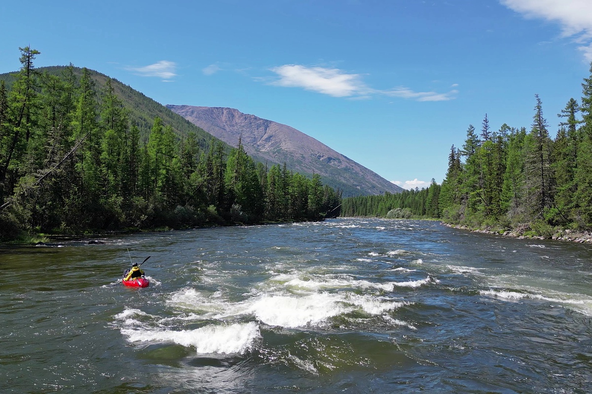 | Mit kräftigen Schlägen legen wir die 20 km lange, seenartige Strecke schon am Vormittag zurück, bis wir an der Mündung des aus dem Norden kommenden Zubringers Tengis Mittag machen. Ein großer Fisch raubt ans Ufer, und beim Ablegen können wir gleich mehrere Taimen („Sibirische Huchen“) erspähen. Es fällt nicht ganz leicht, aber mit der Fischerei wollen wir uns noch gedulden, bis wir den Bereich der hier befindlichen Fischerei-Lodges verlassen haben und ca. 15 km flussab in die menschenleere Wildnis kommen. |