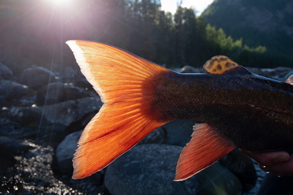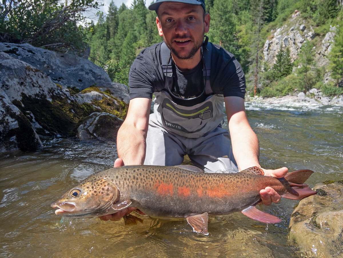 einen Streamer, bis er endlich hängen bleibt. Der Shishkhid ist bekannt für große Lenoks (in diesem Einzugsgebiet kommt nur der Spitznasen-Lenok vor, Brachymystax lenok), mit den 68 cm die dieser hier misst ist das Ende der Fahnenstange bei weitem nicht erreicht. Als ich erneut auswerfe, schießt ein knallroter Taimen hervor, wohl fast einen Meter lang, leider kann ich den aber ebenfalls nicht verheften und bekomme keine weitere Chance. |