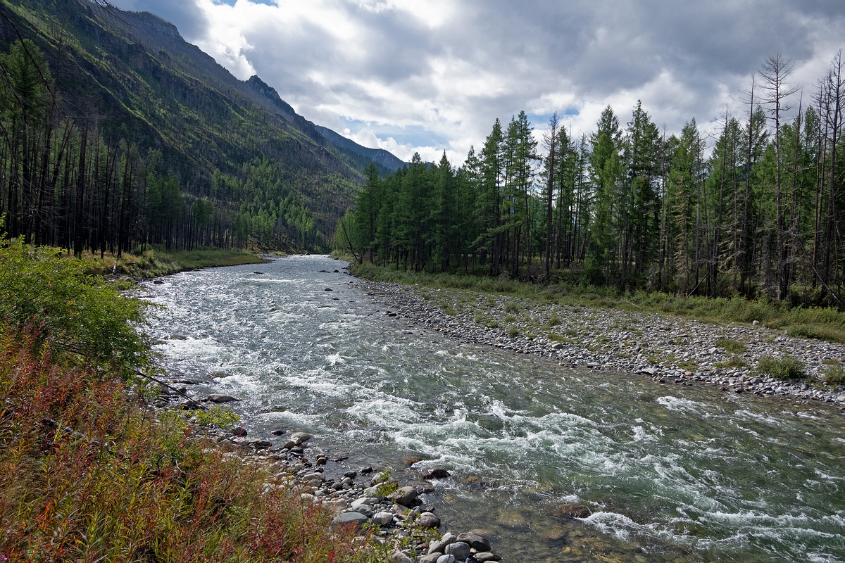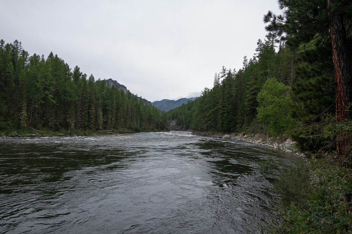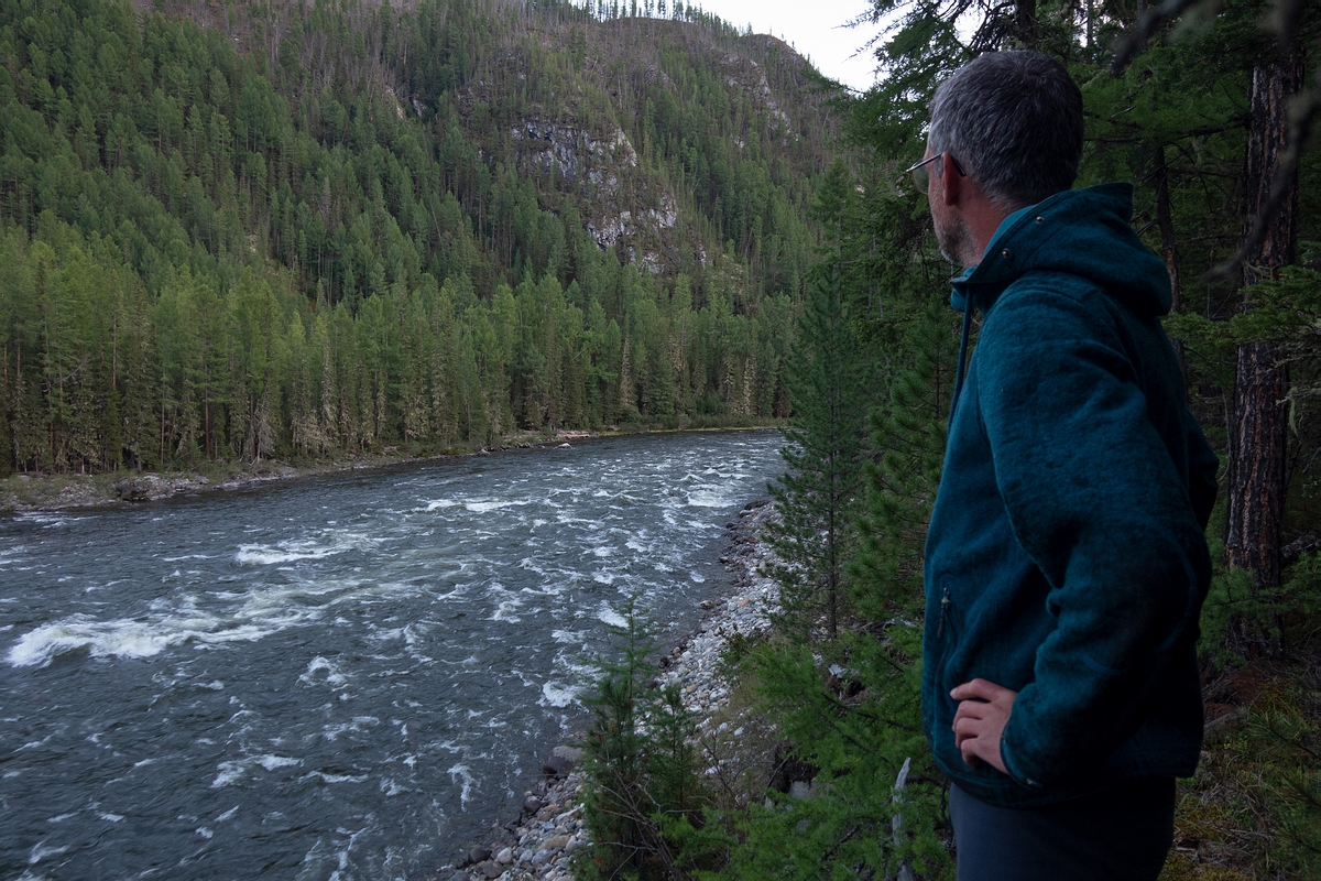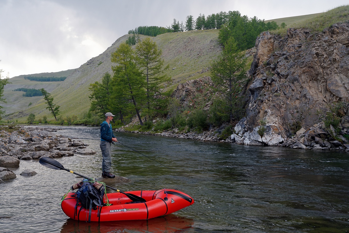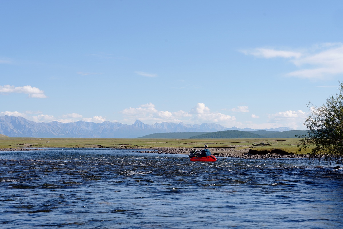 | Im weiteren Verlauf mäßigt sich das Gefälle des Hug und der Fluss holt zu immer weiteren Schlingen aus, die die gesamte Talbreite umfassen. Er bildet wunderschöne tiefe Züge, wir sind vom glasklaren, türkisgrünen Wasser ebenso begeistert wie von den traumhaften Strukturen und Fischeinständen. Es ist kaum zu glauben, dass hier nicht auch Taimen vorkommen. Ich lasse wiederum die Rehhaarmaus über die besten Stellen furchen, aber kein Großfisch stürzt sich auf das reizende Angebot. Sogar die ersten, sporadischen Lenoks finden wir erst am dritten Bootstag auf dem Hug. Rückblickend wäre es besser gewesen, die unglaublich gute Trockenfliegenfischerei auf Äschen in vollen Zügen zu genießen, als sich mit der erfolglosen Großfischsuche aufzuhalten. |