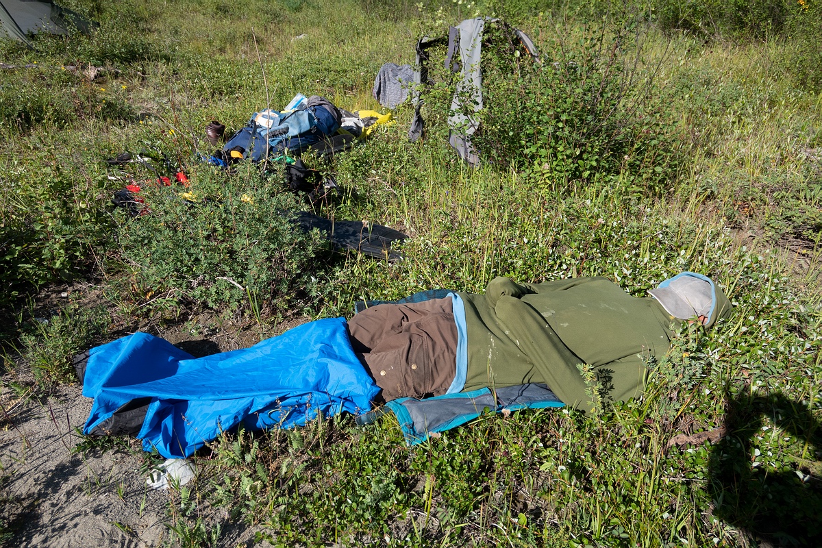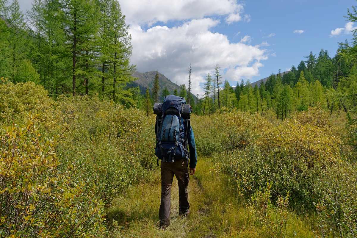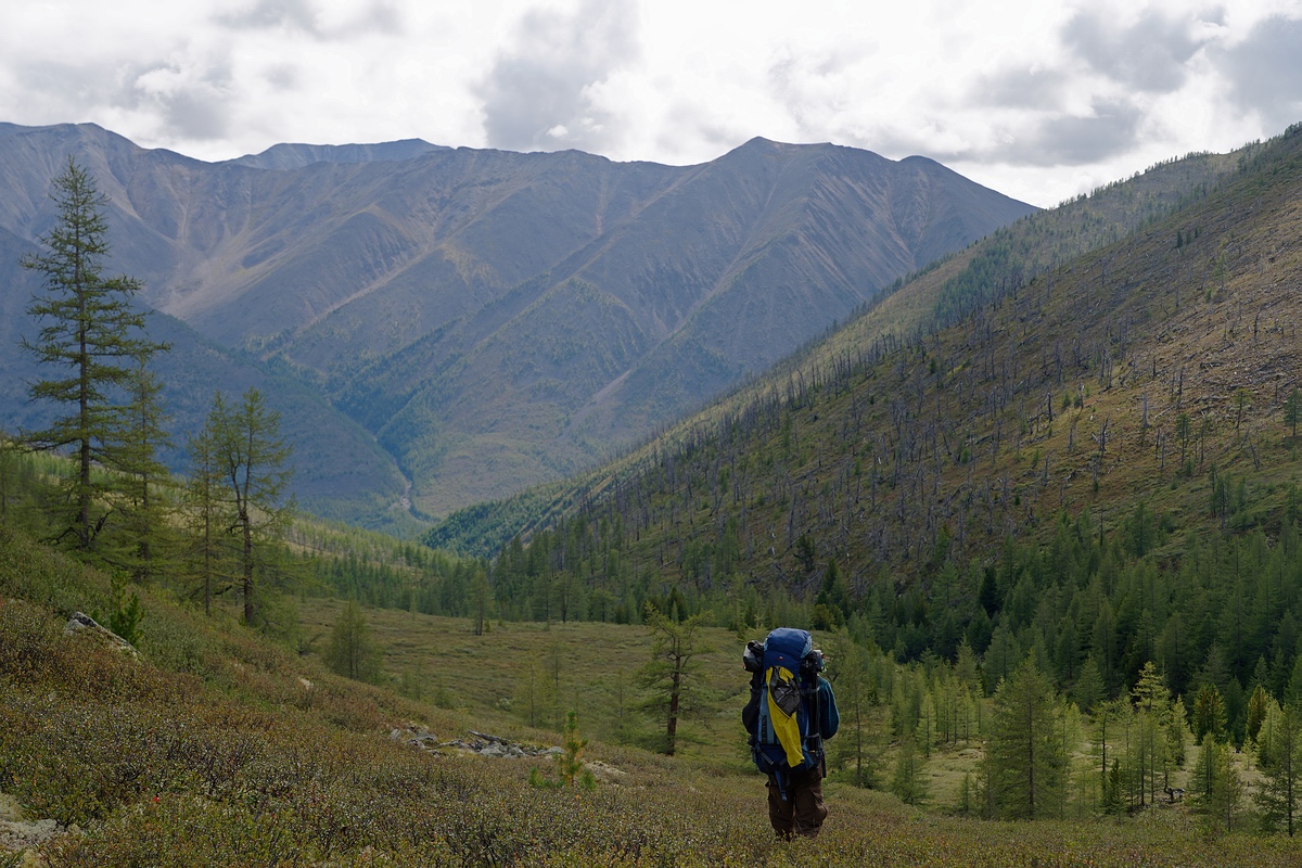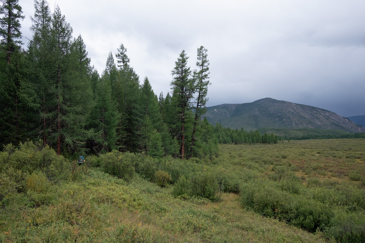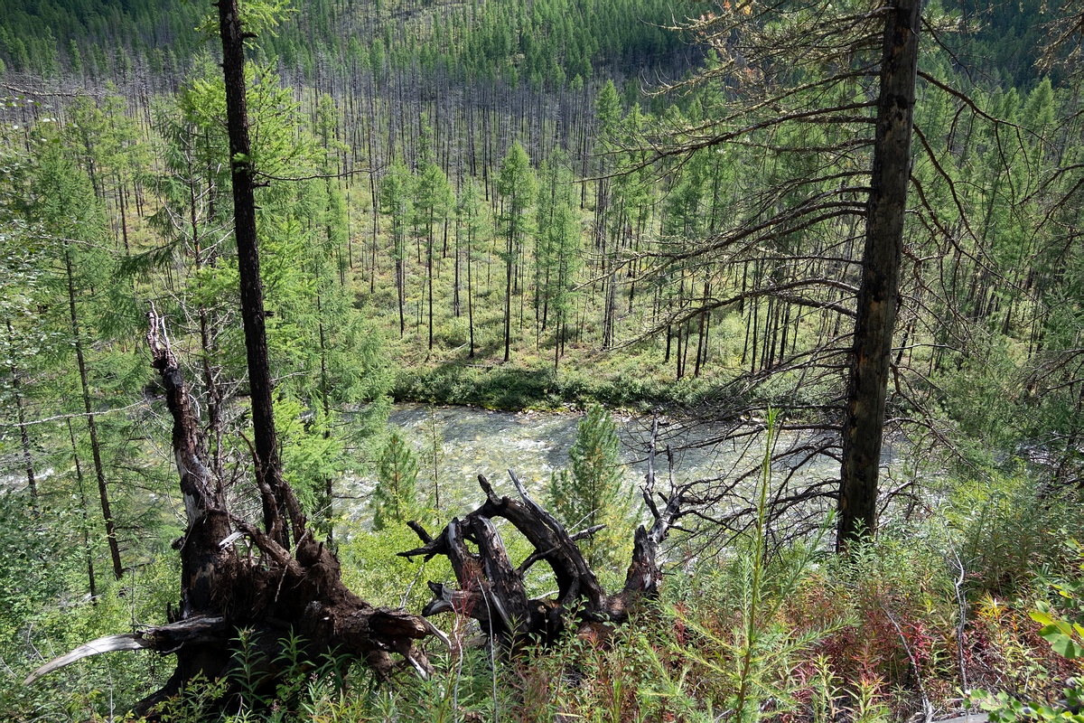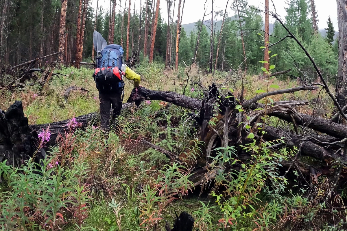 Schwer bepackt steigen wir also aus dem Flusstal in die Taiga des nördlichen Abhangs. Offensichtlich sind vor wenigen Jahren hier sehr große Flächen abgebrannt. Man möchte meinen, dass solches Waldbrand-Gelände ein günstigeres Marschgelände bietet als dichter Wald. Das trifft aber nicht zu. Es liegen Stämme und Äste kreuz und quer, die ständig umgangen oder überklettert werden müssen, dazwischen rankt teils dorniges Gestrüpp. Vor dem Anstieg machen wir mit großer Verspätung Mittagspause in einem trockenliegenden Bachbett. Völlig durchnässt müssen wir paradoxer Weise länger auf die Suche nach Wasser zum Kochen gehen und finden zum Glück einen kleinen Tümpel im Wald. Im weiteren Verlauf wird das Gelände steiler, die offenen Flächen der Hänge sind noch schlimmer. Sie sind mit dicken Torfmoospolstern bewachsen, wo man bei jedem Schritt dezimetertief einsinkt. Unsere Fortbewegung wird hier quälend langsam und extrem anstrengend. |
