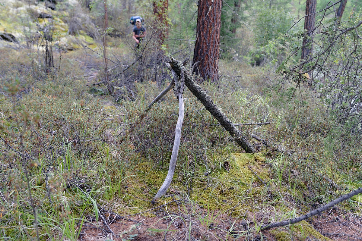 Trockenfischerei, den vom Rucksack geplagten Rücken zu entspannen und ein paar Momente ohne Anstrengung zu genießen. Denn der Marsch wird zunehmend schwieriger, wir finden keine Zaaten-Wege und sehr oft auch keine Wildpfade mehr und müssen uns durch dichtes Gestrüpp, steile Hänge mit Unmengen an Totholz oder schmale, quergeneigte Uferböschungen kämpfen und ständig den Bach queren. So anstrengend das auch ist, bietet es doch ein kurzweiliges, archaisches Abenteuer, sich den Weg durch eine so ursprüngliche, menschenleere Wildnis zu bahnen. Man entwickelt dabei ein gutes Gespür für die vorhandenen Landschaftsstrukturen und den bestmöglichen Weg auf den unterschiedlichen Skalen von den nächsten paar Schritten bis hin zu Tagesetappen und ganzen Tälern. |