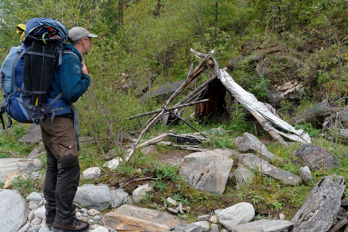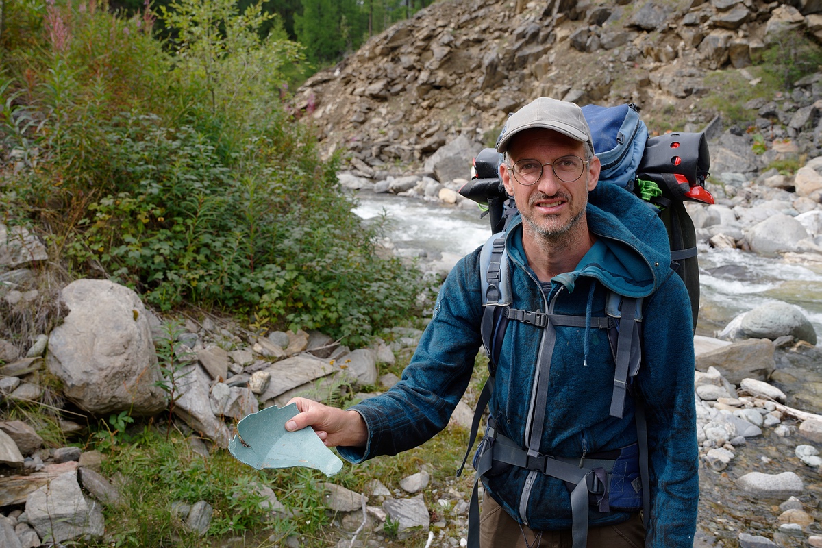 Waren ganz unten am Jolgo weder menschliche Pfade, noch Stümpfe abgeschnittener Stämme oder irgendwelche anderen Kennzeichen menschlicher Aktivität zu erkennen gewesen, so fällt uns erstaunlicherweise mehr und mehr Plastikmüll auf. Schnüre, Reste blauer und weißer Plastiksäcke, Gummihandschuhe, Stiefel etc., das Ausmaß die Wildnis verschandelnder Gegenstände wird immer ärger und erreicht mittlerweile ein wirklich beschämendes Ausmaß. Vermüllen tatsächlich die Zaaten die Landschaft so stark? Erst als ich eine zerbrochene, flache Plastikschüssel finde, wird die Antwort klar: Das ist eine Pfanne zum Goldwaschen, es handelt sich um typische Abfälle von Goldsuchern! Ein kleines Seitental hat wohl großes Hochwasser geführt und Unmengen an Schotter, Schwemmholz und ein extremes Ausmaß an derlei Plastikmüll in „unseren“ Oberlauf geschoben. Offensichtlich lag in diesem Seitental die Hauptaktivität dieser Glücksritter, weiter flussauf nimmt der Müll glücklicherweise stark ab. Erstaunlich, in welche entlegenen Täler es diese verzweifelten Gestalten getrieben hat. |