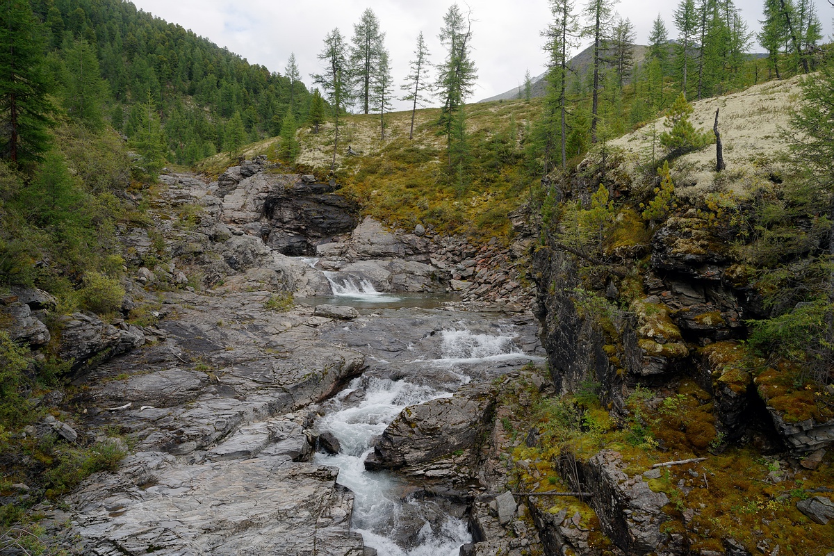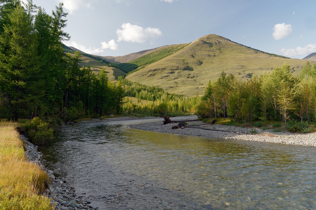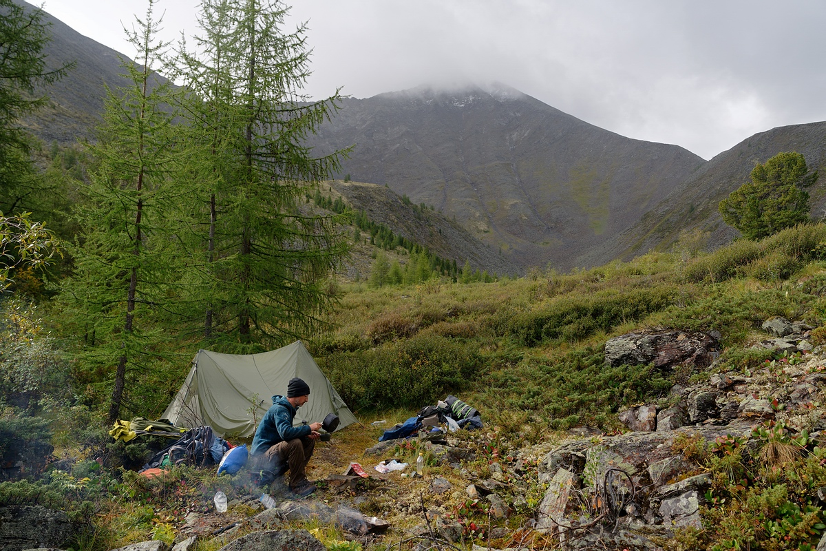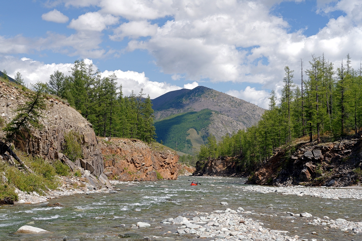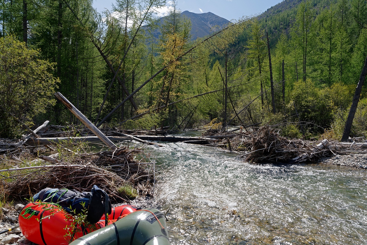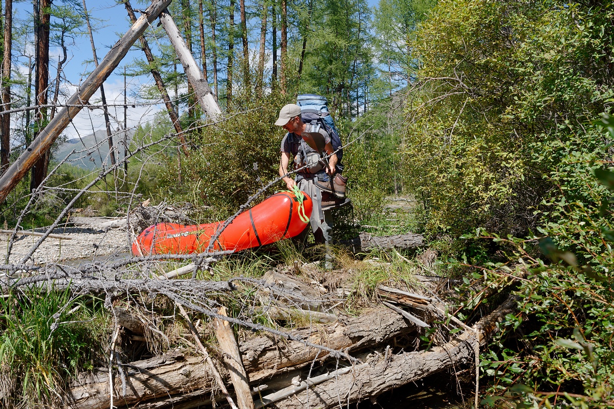 Trotz der vielen Aufregungen am Taimenfluss Shishkhid sind wir mittlerweile schon fast an unserem Etappenziel angekommen, dem linken Zubringer Jolgo Gol [Gol heißt Fluss auf Mongolisch], der unweit der russischen Grenze unseren Ausstiegspunkt bilden soll. Vier Kilometer davor verengt sich das Tal zu einer schlecht einsehbaren Schlucht. Hier einfach „um die Kurve“ zu fahren wäre viel zu gefährlich, das Wildwasser muss zuvor eingesehen werden und es muss klar sein, dass man gegebenenfalls umtragen kann und nicht bei senkrechten Felswänden ansteht. Diese Aufklärung kann durchaus eine Stunde und mehr dauern. Wir entschließen uns zu einem anderen Weg. Nachdem wir es wohlbehalten bis hierher geschafft haben, wollen wir einfach keine Risiken mehr eingehen. Auf der Karte ist zusehen, dass wir das Tal des Jolgo über einen kleinen Pass auch von hier aus erreichen können. Wir tauschen dadurch 4 km gefährliche Wildwasserstrecke gegen eine 7 km Marschetappe, die allerdings mehr als 500 Höhenmeter Anstieg beinhaltet. |