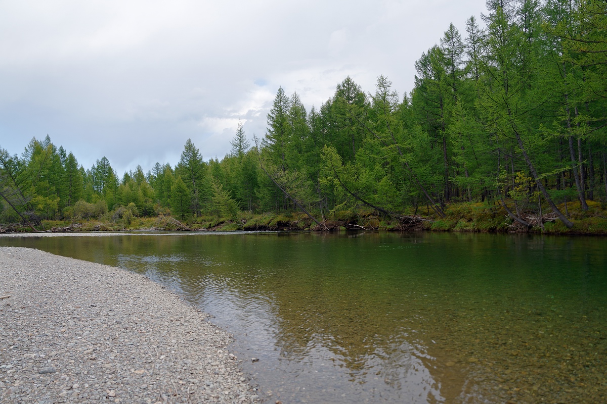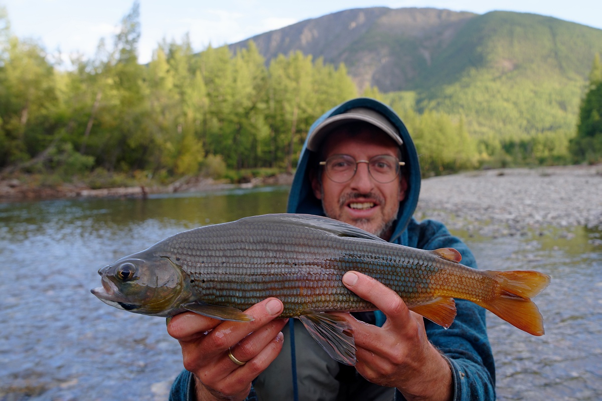 | Zu früh gefreut, denn schon steht senkrechter Fels an, der eine Querung erfordert. Der Fluss ist im Gegensatz zum Shishkhid eiskalt, und an guten Stellen gerade eben seicht genug für eine Querung. Die Schuhe sind sowieso nass (und werden das die ganze Woche lang bleiben), wir queren also mit dem normalen Schuhwerk. Die wunderschöne Landschaft entschädigt für die Strapazen, und ein zwei mal stecken wir unterwegs die Rute zusammen um zu fischen. Neben den fast allgegenwärtigen, vorwiegend kleinen Äschen geht in einem größeren Kolk – der Unterlauf besteht ansonsten fast nur aus eher seichten, rasch fließenden Rauschen – ein schöner Lenok an den Haken. Leider flüchtet er beim Fotoshooting und bleibt undokumentiert. Der Jolgo wäre groß genug, um auch Taimen Lebensraum zu bieten, und so beschäftigt uns die Frage, ob wir in den größten Kolken auch solche hier finden können. Nach der Antwort suchen wir mit Hilfe der Rehhaarmaus, die sich zuvor als effektiver Taimenköder erwiesen hat. Leider ohne Interessenten. |