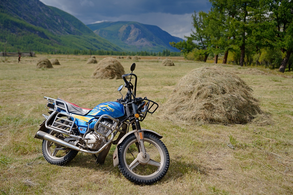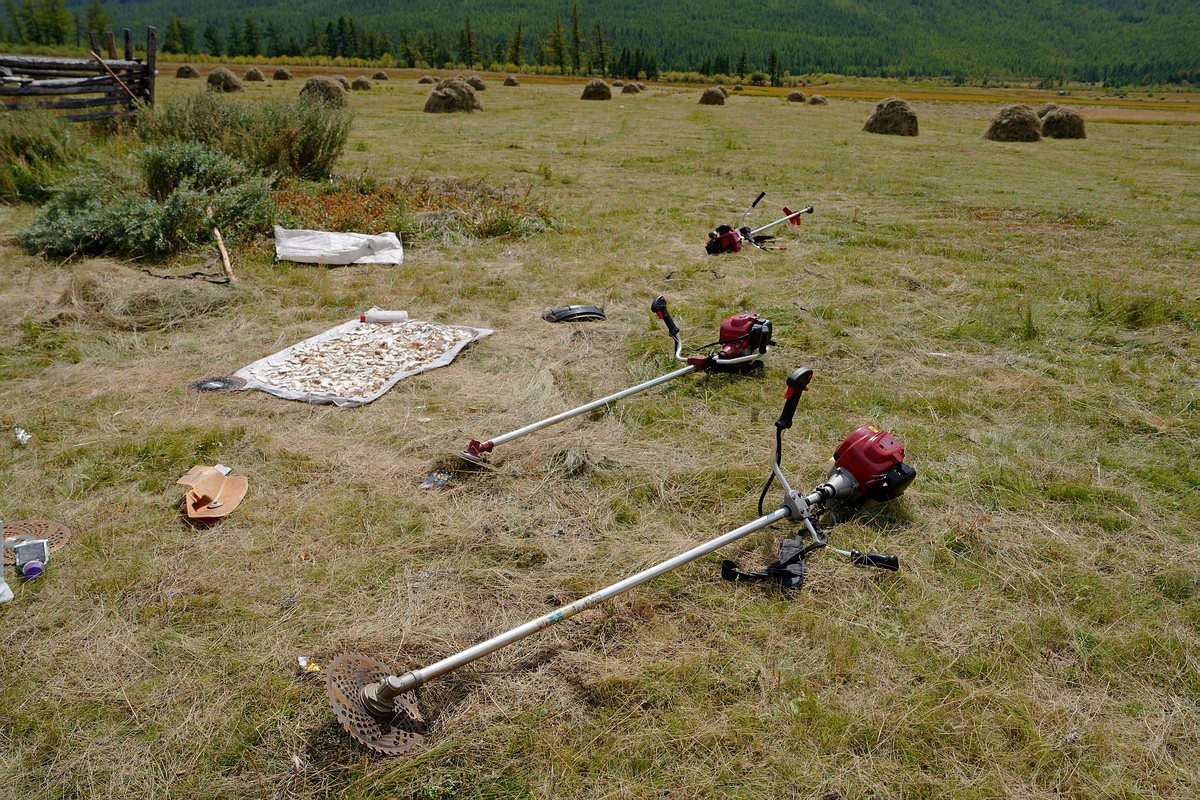| Wir erreichen schließlich die Ebene, wo wir den Einheimischen beim Mähen und Heu machen zusehen. Die Nomaden treiben ihre großen Herden, die jetzt noch weiter flussab im weiten Darhad Becken weiden, im Herbst in diese Gebirgstäler, wo sie von den Heureserven zehren können. Auch Schutz vor Wind und Schnee durch den Wald und das vorhandene Brennholz dürften in den Tälern im langen und eiskalten mongolischen Winter von großem Vorteil sein. |