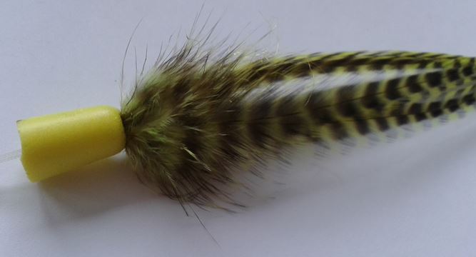 Der „earplug hover“ wird, wie der Name es ausdrücken soll, schwebend unter der Oberfläche geführt. Die Ohrenstöpsel nehmen minimal Wasser auf, dieses führt dazu, das der Streamer wie schwerelos und nur leicht sinkend unter der Oberfläche fischt. Bei Zug entstehen durch den voluminösen Kopf und den an der flexiblen Backing-line aufgefädelten Ohrenstöpsel eine Menge Verwirbelungen, Blasen und Geräusche unter Wasser. Durch die Anordnung der Ohrenstöpsel auf der Backingline ist das Hinterteil flexibel und tailt doch nicht ein. Die Saddle Hackles spielen schön, ebenso wie die Marabou Fibern im Vorderteil der Fliege. Eines soll aber nicht verschwiegen werden: durch die minimale Aufnahme von Wasser durch die Ohrenstöpsel hat der Streamer natürlich ein klein wenig Gewicht mehr auf den Rippen. Durch Druck mit den Fingern auf die Ohrenstöpsel kann das Wasser aber leicht ausgedrückt werden. |