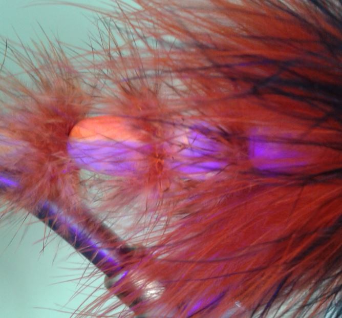 Die erstere habe ich farblich stimmig zu den Saddle Hackle Federn gewählt, die zweite als reine Kontrastfeder. |