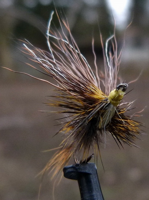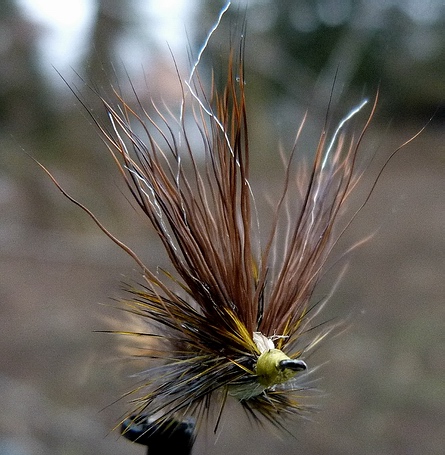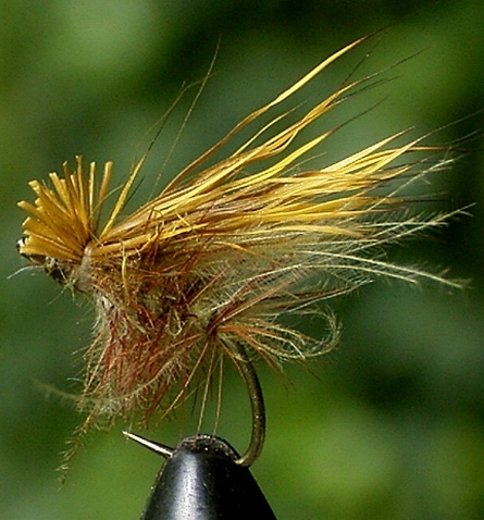 Bindefaden: Ultra Thread 70 brown-olive Schwanz: Mallard Flank Wood Duck gold Rippung: Micro Floss 110 darkbrown Abdomen: Poly II Dub Golden Amber Unterflügel: Deerhair died yellow Flügel: 2 Ccd-Federn olive Hechel: 2 CDC-Federn gelb und dark-olive im Split Füße: Rehhaar braun, getrocknet Petri! Christian |
