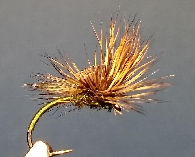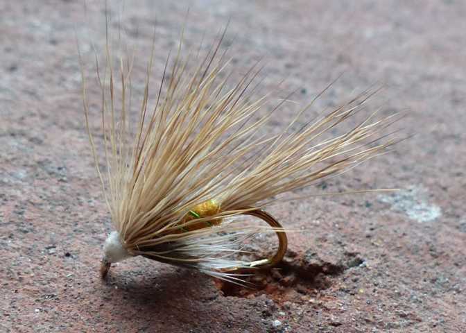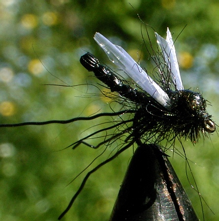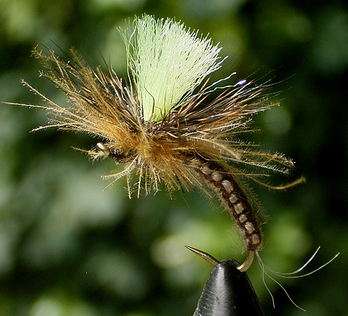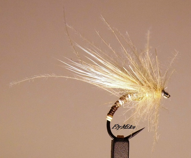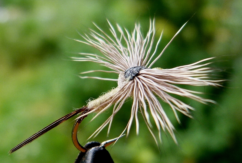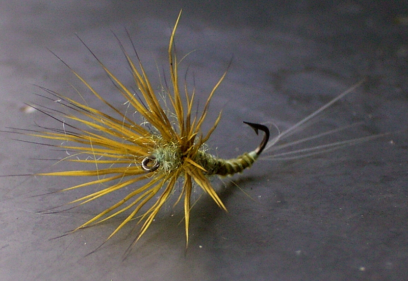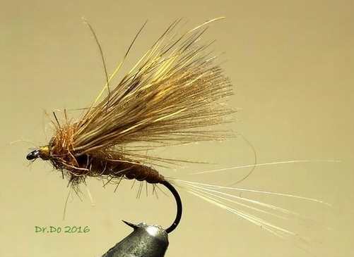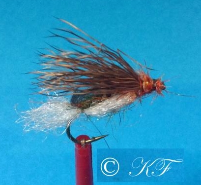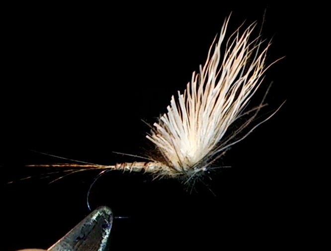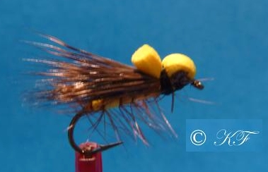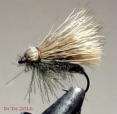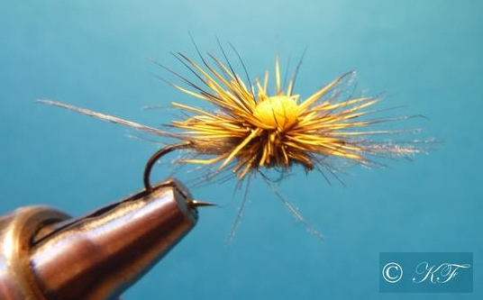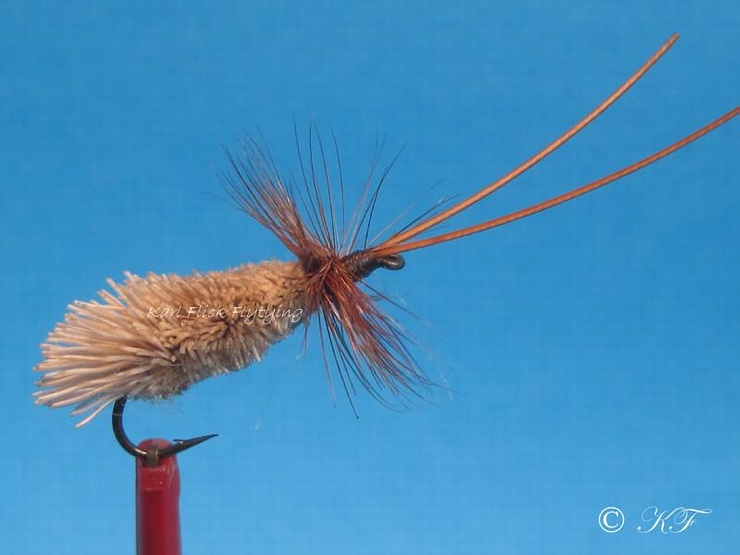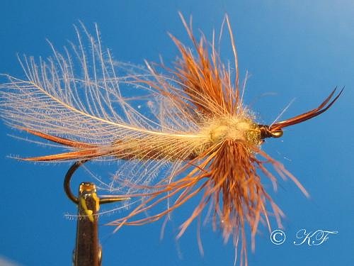 Keine Eigenkreation, sondern ein Muster von Karl-Heinz Kaulig (wenn ich es richtig weiß). Eine Egg Laying Caddis. |