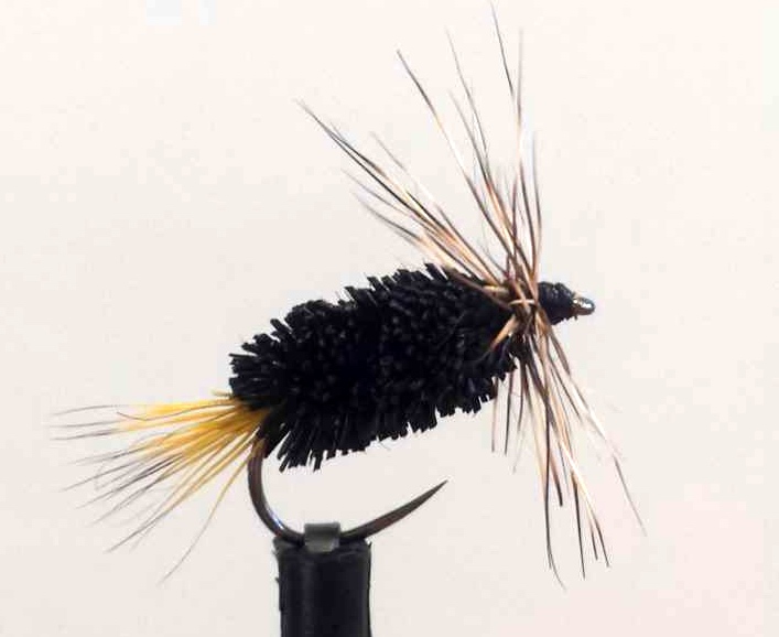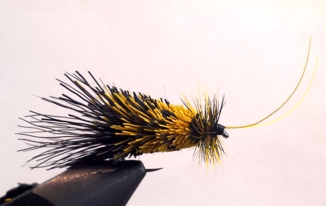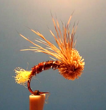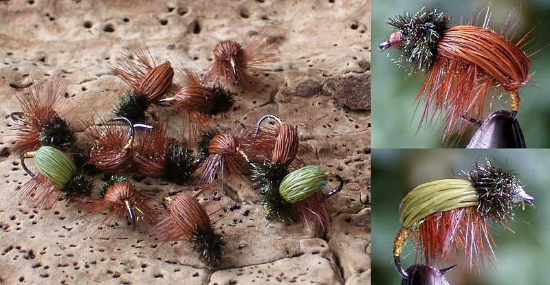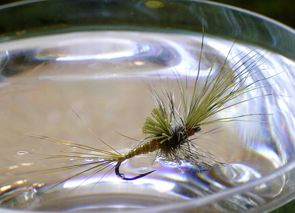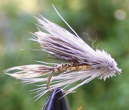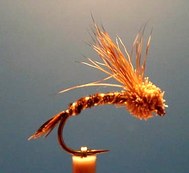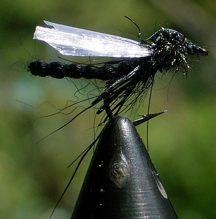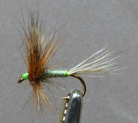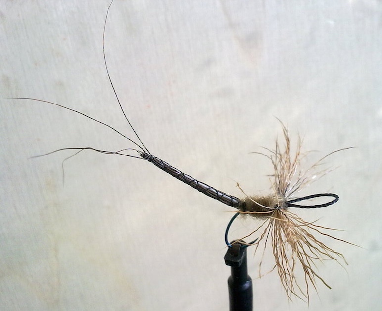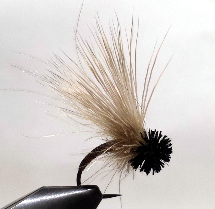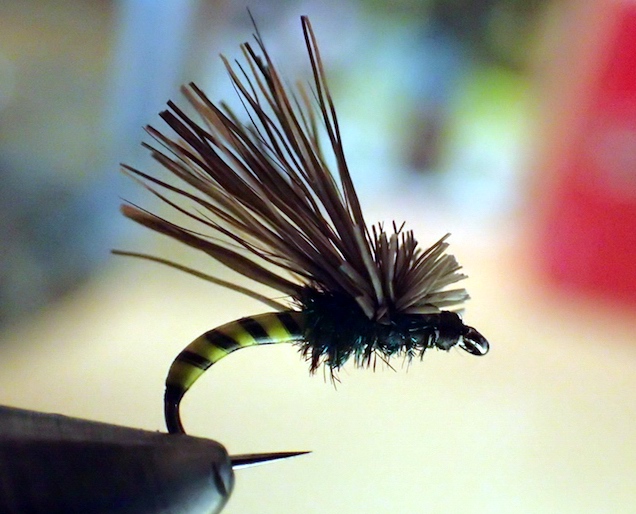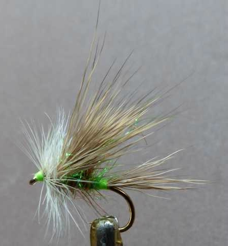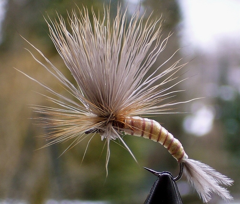Keine Eigenkreation, sondern ein Muster von Karl-Heinz Kaulig (wenn ich es richtig weiß). Eine Egg Laying Caddis. |