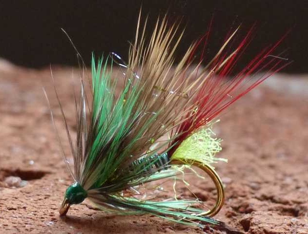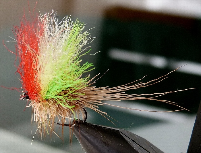 Die Grundidee zu dieser – eher sehr bunten – Trockenfliege, ist ein Biss-Anzeiger (bayer.: „wo samma“ = wo sind wir?), der möglichst unsinkbar, hoch aufschwimmend und auch bei wechselnden Lichtverhältnissen gut sichtbar sein soll. In den Hakenbogen wird dann das Vorfach mit einer Nassfliege oder beschwerten Nymphe angeknüpft. Falls trotzdem mal ein Fisch darauf beisst … will ich mich nicht beschweren. |