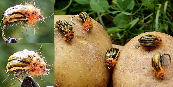 (auch aus'm Archiv - sooo schnell bin ich auch wieder nicht) Haken: emerger oder grub (möglichst dünndrähtig) #10 Bindefaden: Uni Thread 8/0 rusty brown Körper (Unterwicklung und Decke): Rehhaar gelb gefärbt, wenige Haare in schwarz, lackiert Flügeldecke: Moosgummi dottergelb, 2mm Körperdubbing: Mix aus JMP Glitzernymph und Crystal Seal schwarz Thorax: Rabbit Plus Dubb. Orange und Antron rouille Schutzschicht: Window Colour transparent Punkte etc.: Schwarzer Filzstift Petri! Christian |