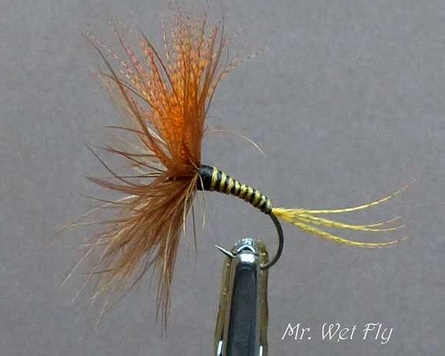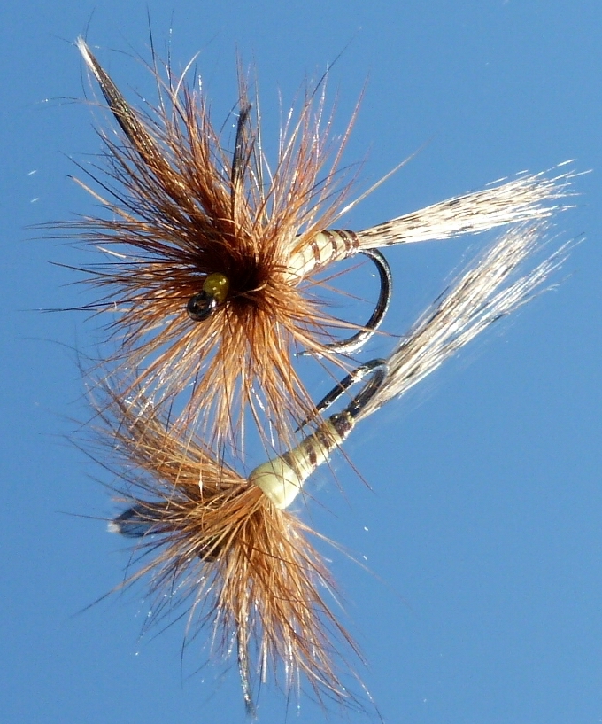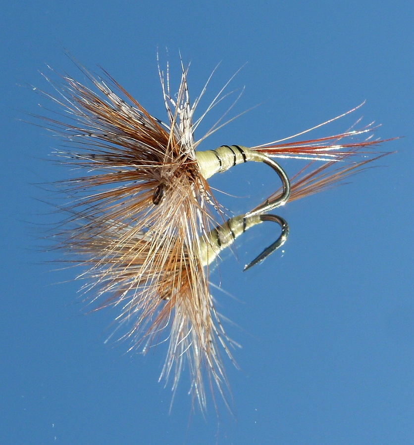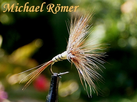 Bindefaden: Ultra Thread 70 Black Körper: Whiting Cape Barred Ginger, kleiner als Hakenbogen! Flügel: 2 Hechelspitzen vom Indischen Rooster Neck rotbraun, schwarz 1. Hechel: American saddle pack brown #14-16 2. Hechel: Whiting 100 Fly Pack Black #16 Veniard Wachs, Half Hitch Tool (Kugelschreiber) Dieses Muster habe ich möglichst nahe am Original gebunden. In der « l’encyclopédie Mouche de Peche », S 149 ist beschrieben, dass es sich hierbei um eine Fliege handelt, die so in etwa eine Steinfliege imitiert und auch in großen Hakengrößen erfolgreich fischt. (Link) Bindeanleitung: