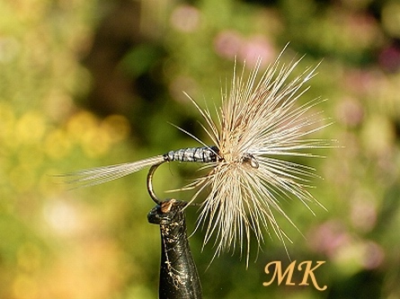 Haken: Fulling Mill Ultimate Dry Fly Hook #16 Faden: Uni Nylon Thread Black Körper: Uni Nylon Thread White Schwänzchen: Fibern einer Sattelhechel braun Hechel: eine helle, eine etwas dunklere Sattelhechel und eine Rebhuhn Feder natur Rippung: Uni Nylon Thread Black |