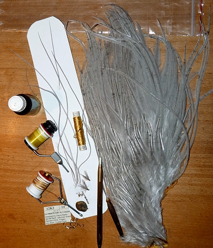 die im Video gezeigten Bindeschritte gehalten und versucht eine einigermaßen passable Fliege zu tüddeln. Wie das bei meinen Fliegen fast immer so ist, entsprechen sie nur selten genau einem vorgegebenen Muster sondern eher dem, was in meinem Materialfundus vorhanden ist. Aus diesem Grunde auch die unkonventionelle Namensgebung. Material: