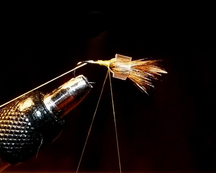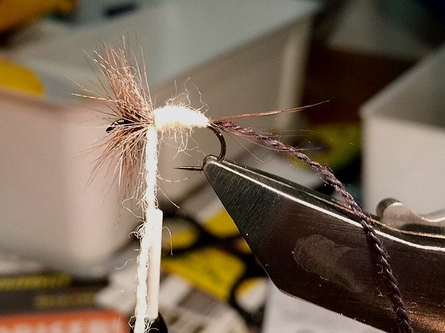 2. 1. Hechel nach vorne weisend einbinden. 3. Hechel möglichst eng mit ca. 7 Windungen anlegen. 4. Abschließen. Rest abschneiden. 5. 2 Hechelspitzen nach vorne weisend einbinden. 6. Mit wenigen Achterschlingen in Position bringen. 7. Mit dem Bindefaden einen Loop bilden. 8. Eine Portion Hasengrannen abschneiden, den Fluff und die Unterwolle auszupfen und auf die entsprechende Länge zuschneiden. 9. In Loop einlegen, verdrallen und in engen Windungen anwinden (Fiebern immer nach vorne streifen). 10. 3. Hechel nach vorne weisend einbinden. 11. Hechel wieder möglichst eng mit ca. 7 Windungen anlegen. 12. Hecheln wieder mit dem Röhrchen nach vorne fixieren. 13. Die Coq de Leon Fiebern abschneiden und im Stacker auf gleiche Länge bringen. 14. Faden wachsen, nach hinten führen und das Schwänzchen fixieren. 15. Rippungsfaden einbinden. 16. Floß einbinden und Bindefaden abschneiden. 17. Mit Floß den Hinterleib formen. 18. Rippung mit 4 – 5 Windungen, 19. mit dem Floss abfangen und dann den Thorax formen (das Röhrchen muss noch die Hecheln zusammenhalten!). Dabei die 3. Hechel nach vorne „schieben“. 20. Whip-finish hinter den Hecheln. 21. Ein Tröpfchen Lack kann da nicht schaden. 22. Röhrchen entfernen, durchbürsten ... |