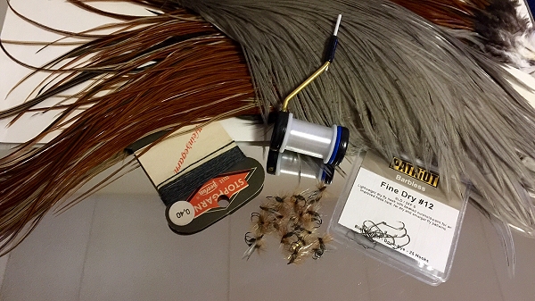 UHG #16 Bindefaden: Ultra Thread 70 yellow 1. Hechel Sattelfedern speckled dark dun 2. Hechel: American genetic dry fly saddle pack medium dun Schwänzchen: Coq de Leon Indio Avellanado rinón Veniard Wachs, Lack, Aquariumschlauch-Stück Info: