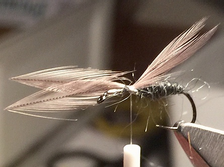 versehen. Allerdings habe ich auch eine Idee von Jean-Paul Dessaigne aufgegriffen und die Grannen vom Feldhasen mit eingebunden. Das hat Aimé meines Wissens nach nie gemacht – dennoch – so finde ich – gewinnt die Fliege dadurch. Ich musste nur noch etwas hin- und her probieren, an welcher Stelle die Flügelspitzen und wo die Hasengrannen eingebunden werden sollten: ganz vorne, mittig oder ganz hinten. Ich entschied mich für die mittlere Position – so können sie gut spielen, werden aber von den Hecheln „am Platz“ gehalten. Bindeanleitung: