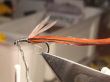 Haken: Trockenhaken Größe 12 Faden: Uni 8/0 Schwarz Hecheln: 2x Hahn schwarz und 1x Rebhuhn rot Schwanz: Hechelfibern schwarz |