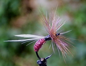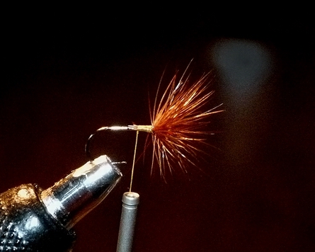 | Das Flügelfliege imitiert fraglos einen Rotspinner und ist - wie das Original - von einer erhabener Schönheit. Der Bindevorgang ist komplex und eher delikat. Die roseefarbenen Hecheln habe ich in Ermangelung der richtigen Farbe durch "lichtbraun" ersetzt. Hakengrößen von #12 bis #16 sind angemessen. Zwei ca. gut hakenschenkellange Hechelspitzen werden V-förmig nach vorne eingebunden, hernach werden 2 in der Größe geeignete Hahnenhecheln bester Qualität im richtigen Abstand eingebunden. |