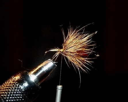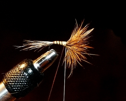 Bindefaden: Ultra Thread 70 golden olive Schwänzchen: Fiebern von einer grauen Sattelhechel Körper: Gütermann Seide, Col 488 (goldgelb), nur 2 Fäden, gewachst Palmer: American saddle pack medium dun #14-16 Flügel: 2 Hechelspitzen vom Sattel speckeld medium dun Veniard Wachs, Half Hitch Tool (Kugelschreiber), Lack Bei diesem Muster wollte ich gerne so eine „ältliche“ Anmutung haben, schon nahe am Original, aber doch mit z.T. modernen Materialien. Deshalb die Gütermann Seide (wo mir das Köpfchen dann leider nicht immer so geglückt ist), aber auch genetische Hahnenhechel. In der « l’encyclopédie Mouche de Peche », S 149 ist sie als Sedge – gerne auch schlitternd, beschrieben. Bindeanleitung: