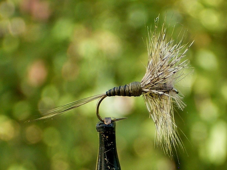 Haken: Fulling Mill Ultimate Dry Fly Hook #14 Faden: Uni Thread Trico 17/0 Körper: Mink Natur Dubbin olive Flügel: eine mit Urethan Kleber behandelte Mallard Flank Feder Hechel: im Fadensplit verdrallte CDC Feder natur, Sattelhechel braun |