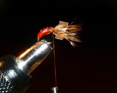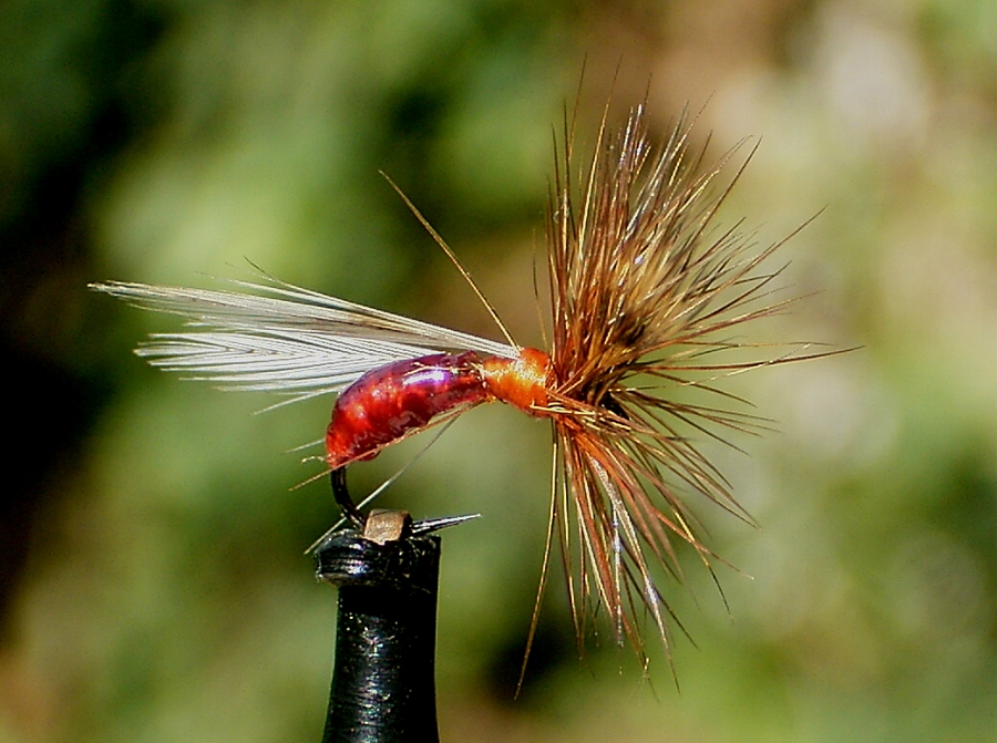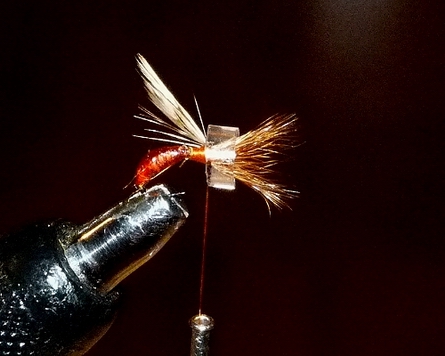 | Die Hecheln werden anschließend mit der Hinteren beginnend nach vorne ! gewunden. Die 2. (vordere) Hechel wird durch die V-förmigen Flügel gewunden und diese durch geschicktes Manipulieren aufgestellt, mit ein paar Fadenwicklungen fixiert und mit dem Kopfknoten abgeschlossen. Dann wird der berüchtigte Ring von Hinten aufgestülpt, so dass die ganze Tackelage nach vorne Richtung Öhr gedrückt wird. Nun wird mittels einem Rouge-farbenen Faden der konische Körper, das Fiebernstoß-Schwänzchen und der weiße Rippungsfaden aufgebaut bzw. eingebunden und der Vorgang durch einen abdominalen Abschlussknoten abgeschlossen. Schon fertig. |