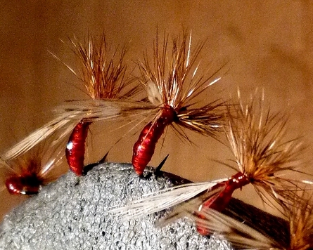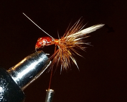 Bindefaden: Ultra Thread 70 Burnt Orange Hinterleib: Gütermann Seide Col. 155 (orange), gewachst 1. Hechel: Indischer Hahnenskalp honigbraun 2. Hechel: Genet. Hahnenhechel Whiting Pack 100 #14 braun Flügel: Indischer Hahnenskalp Badger Hechelspitze Veniard Wachs, Dubbing Wax Runny verdünnt, dünnes Schlauch-Stück (Tube) In einer Serie (513 – 527) von Ameisen