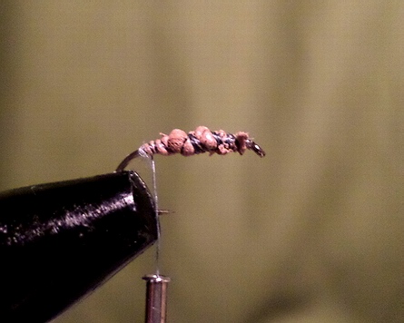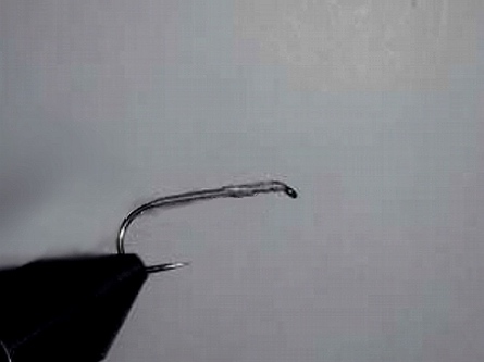 Zuerst wird der Haken eingespannt und eine Grundwicklung bis zum Beginn des Hakenbogens gelegt. Dort angekommen formt man einen kleinen Knubbel, „Oarscherl“. Dieses Bewirkt dass anschließend die Ginger Fiebern schön abgespreizt werden. Danach den Faden bis etwas über die Hakenspitze zurückführen. |