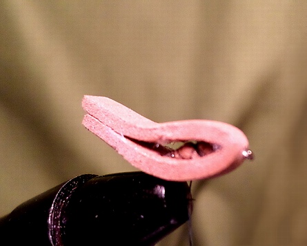 | Mit dem Kugelschreiber wird nun mit Hilfe der Schablone (langgezogene Raute) die Form nachgezeichnet. Anschließend bekommt sie mit dem scharfen Messer einen Querschnitt für den Kopf und dann mittig noch einen angepasst auf die Größe des Hakens. | Der Haken wird mit Kleber bestrichen und der Körper am Längsschnitt drauf gedrückt. |
