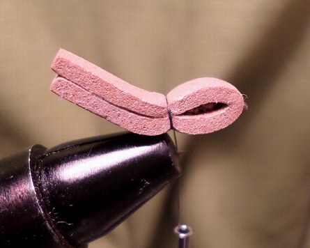 Nun kann die Hahnenhechel ebenfalls nach vorne gewunden und abgebunden werden. Um keine Fiebern in den Kopfknoten mit einzubinden, habe ich über meinem Bobbin einen kleinen pinken Gummischlauch, mit dem ich die Fiebern zurückschieben kann. Nach dem Kopfknoten (der eventuell lackiert werden kann), schneide ich die Fiebern unterhalb des Hakens ab, sodass das Oarscherl satt auf der Oberfläche aufliegt. |