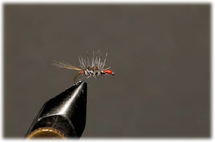 Haken: Dohiku 301 #18 Bindefaden: Traun River Technical Tying Thread 12/0 Schwänzchen: Spinnet Tails barred Dubbing: Master Dub adams grey Beinchen: Cdc in dun Flügel: Polypropylene weiß Flügelscheide: Polycelon rot Bindeanleitung: