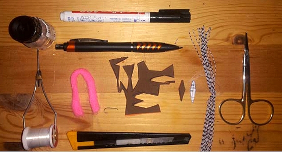 Haken: Trockenfliegen Haken Size 12 Flügel: Rehhaar Unterbau für Körper: Moosgummi-Reste Körper: Moosgummi braun Beine: Rubberlegs verknotet Weitere Materialien: Alleskleber/Sekundenkleber, Rasierklinge oder Skalpell, schwarzer wasserfester Stift Die Rubberlegs habe ich übrigens nach diesem Spartip gewonnen: (Link) Bindeanleitung: