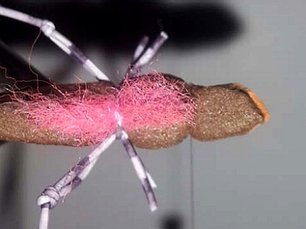 | Das Bindegarn wird nun in einem Schwung bis kurz vor das Hakenöhr gelegt. | Hier werden nun jeweils die letzten Beine eingebunden und der Abschlussknoten gesetzt. Nun werden alle Stellen, an denen Beine liegen, mit Klebstoff extra gesichert. Anschließend werden diese etwas eingekürzt. Bei den Doppelbeinen werden die Überstände vorne abgeschnitten. |