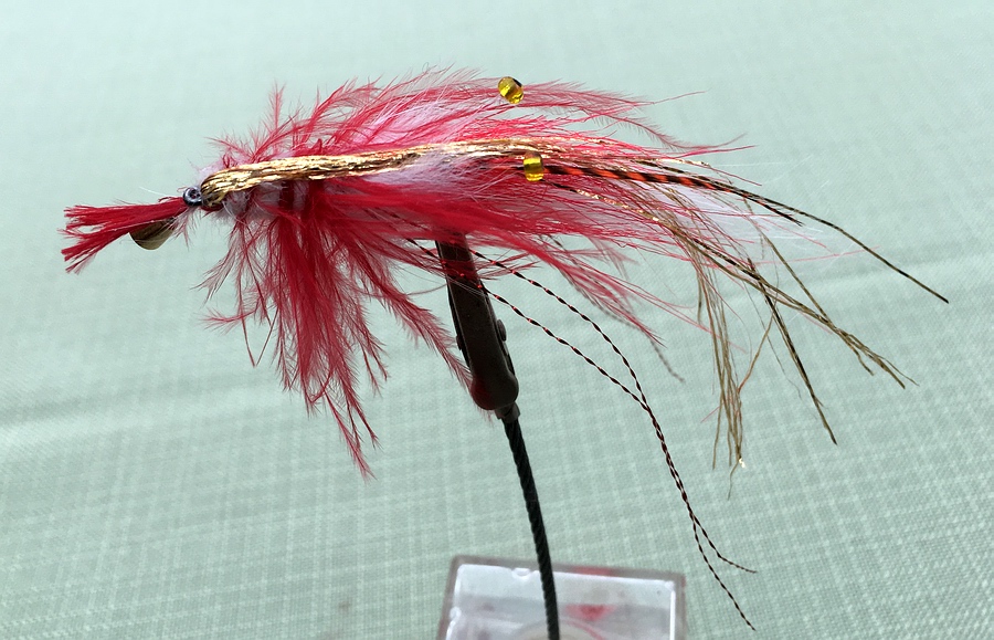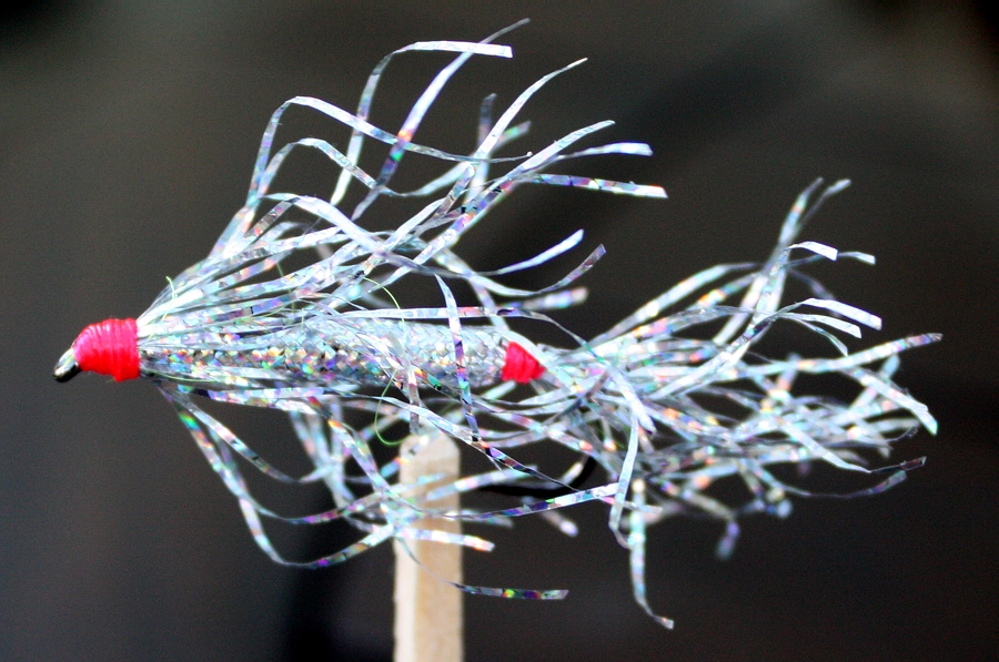 Herzlichen Glückwunsch! Hoffi sandte uns seine "Merry Shrimp-Mas" Fliege aus Ostfriesland zu, natürlich standesgemäß mit Glöckchen! Das 12 cm lange, fischbare Muster wurde auf einem Shrimphaken der #2 komponiert, an Materialien kamen Craft Fur (weiß), Maraboufedern (weiß und rot), Flash (gold), Perlen aus dem 1€-Shop und Mono als Augen sowie ein Tungsten Conehead, gold, mit Bastelperle als Glocke zum Einsatz. |